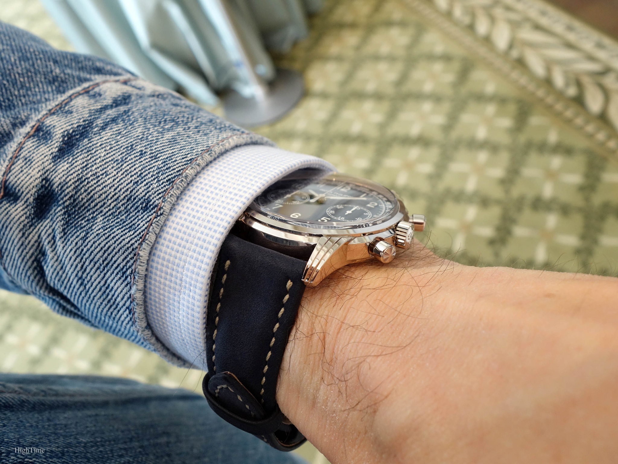 The watch is housed in an 18k white gold case, measuring 41mm in diameter. It is powered by the in-house caliber CH 29-535 PS, a manual-wind chronograph movement known for its column-wheel control and horizontal clutch. This movement provides a power reserve of approximately 65 hours and is visible through a sapphire crystal case back. The front crystal is also sapphire, protecting a blue varnished dial with applied Arabic numerals.