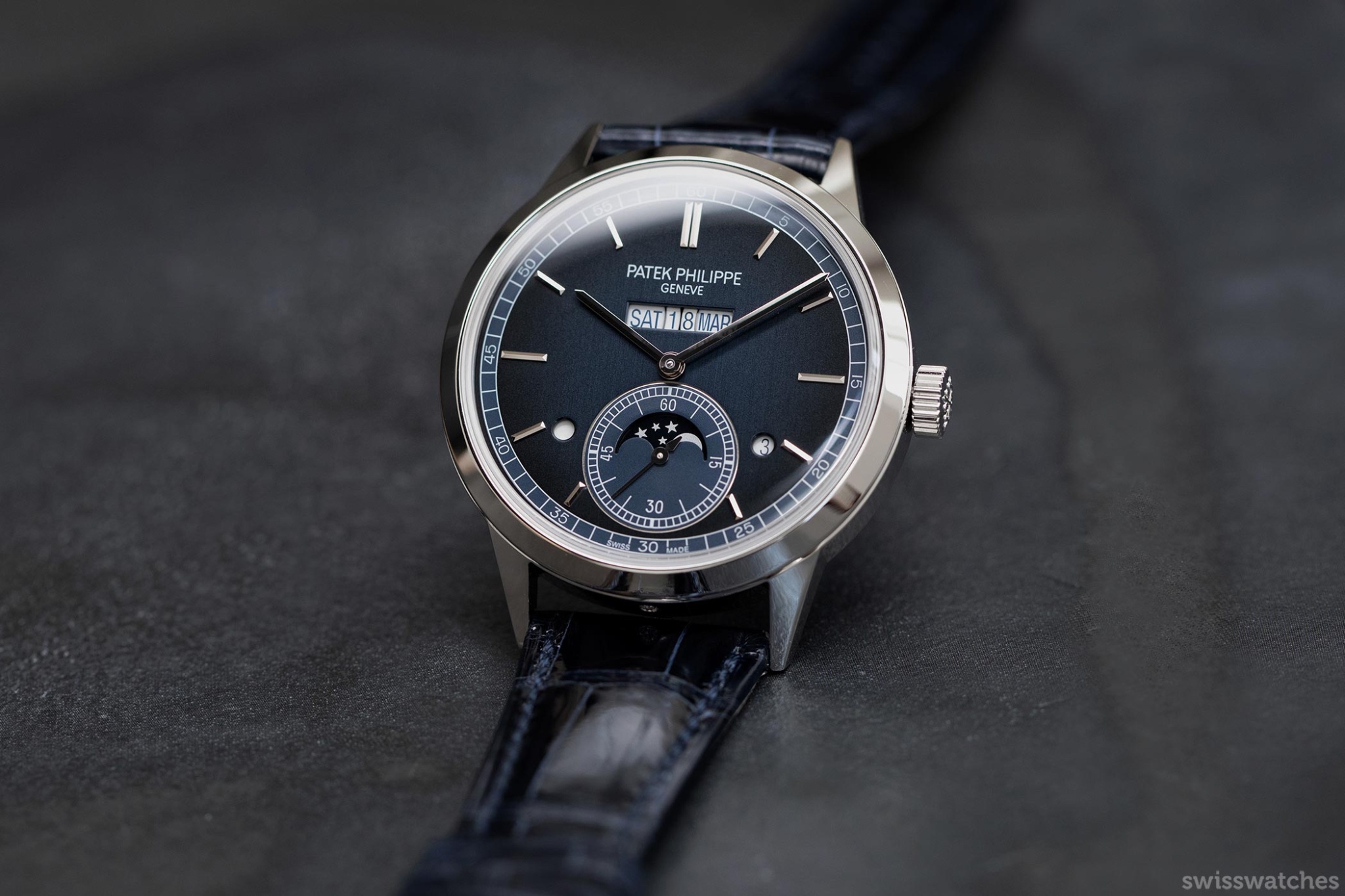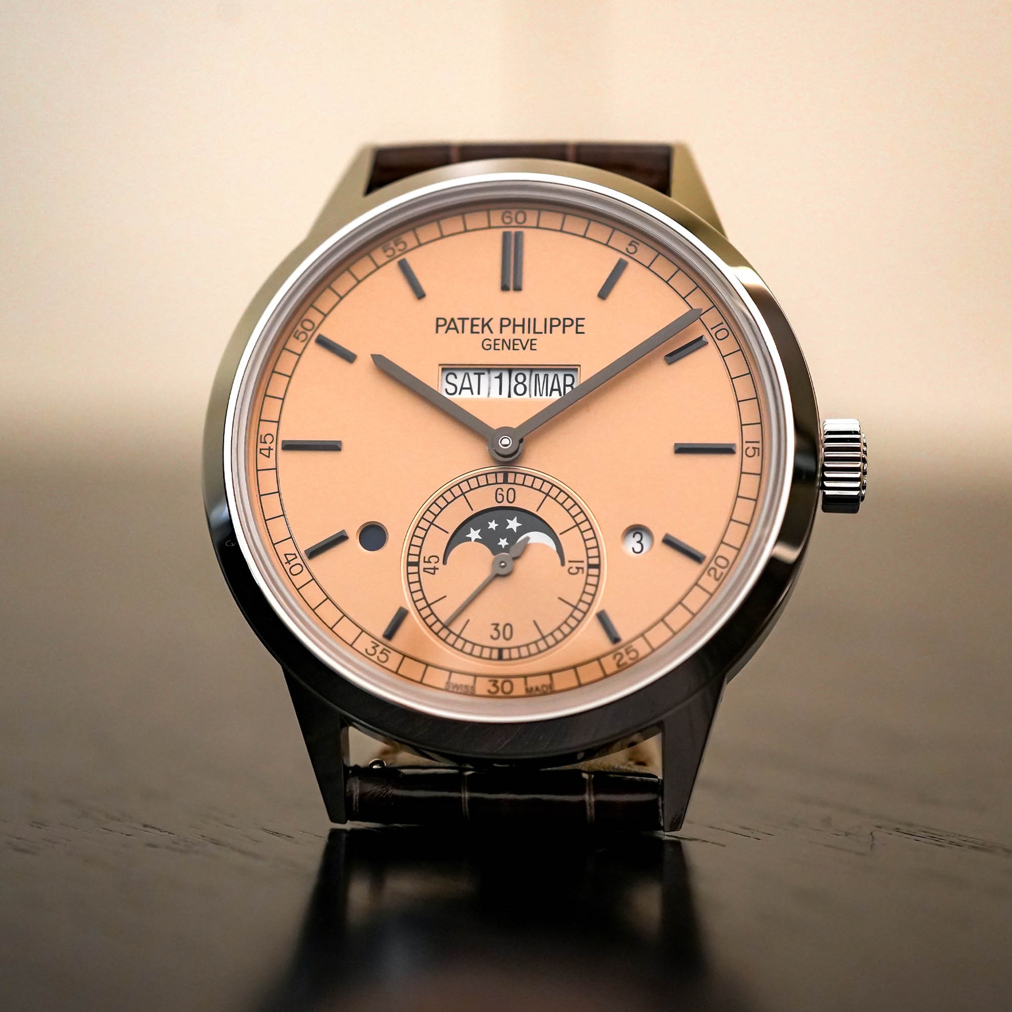 The Complications reference 5236P is notable for its in-line perpetual calendar display, a distinctive arrangement that presents the day, date, and month in a single aperture at 12 o'clock. This design choice offers a clean and highly legible presentation of complex calendar information, differentiating it from other perpetual calendar models that typically use multiple subdials. Introduced in 2021, this reference quickly became a point of interest for collectors seeking innovative calendar displays within a classic Patek Philippe framework.