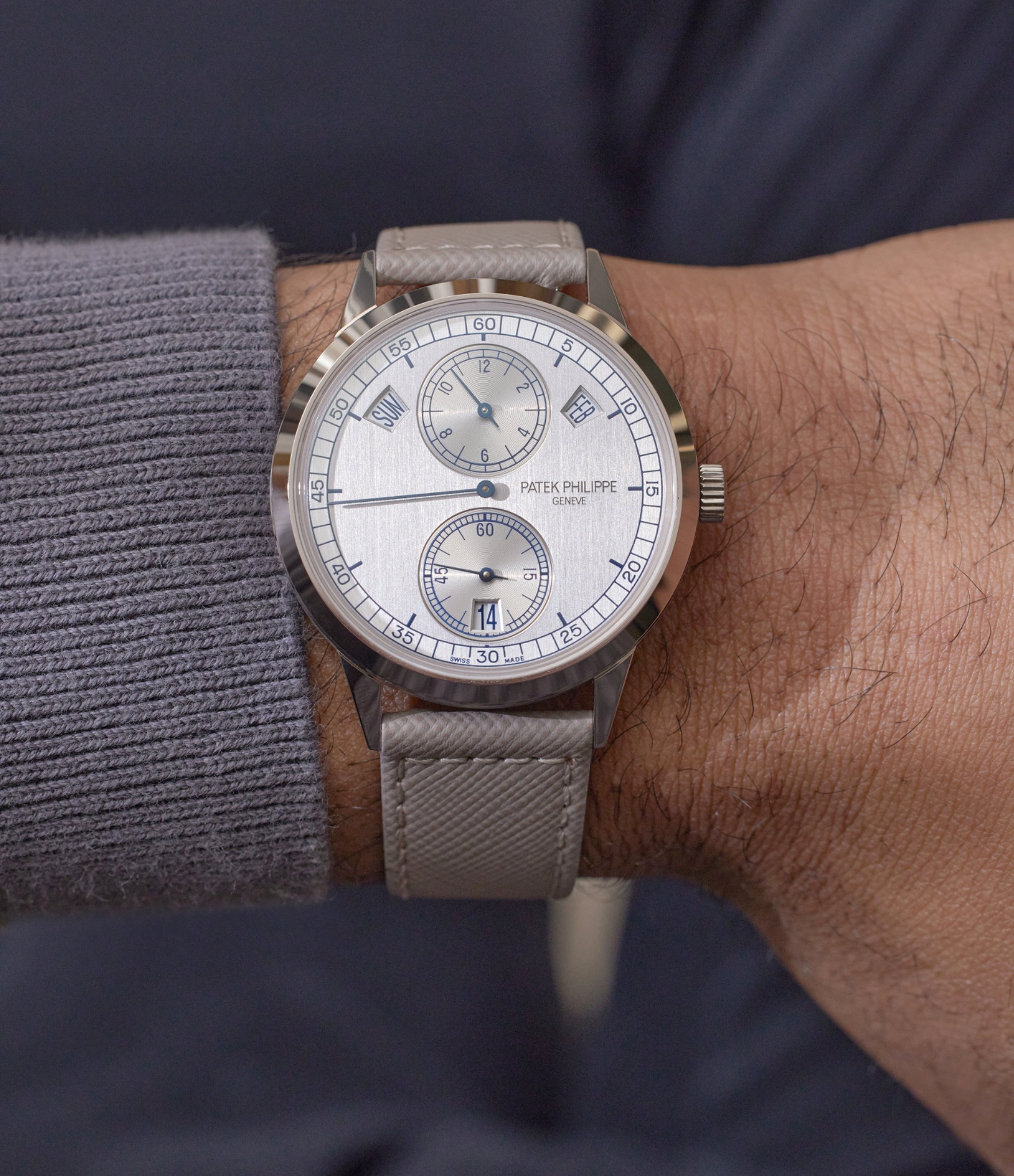 Crafted in platinum, the case of the 5236P measures 41.3mm in diameter and houses the self-winding caliber 31-260 PS QL. This movement is equipped with a platinum micro-rotor and operates at a frequency of 4 Hz, providing a power reserve of approximately 38 to 48 hours. The watch features a sapphire crystal on both the front and the exhibition case back, allowing for a view of the meticulously finished movement.