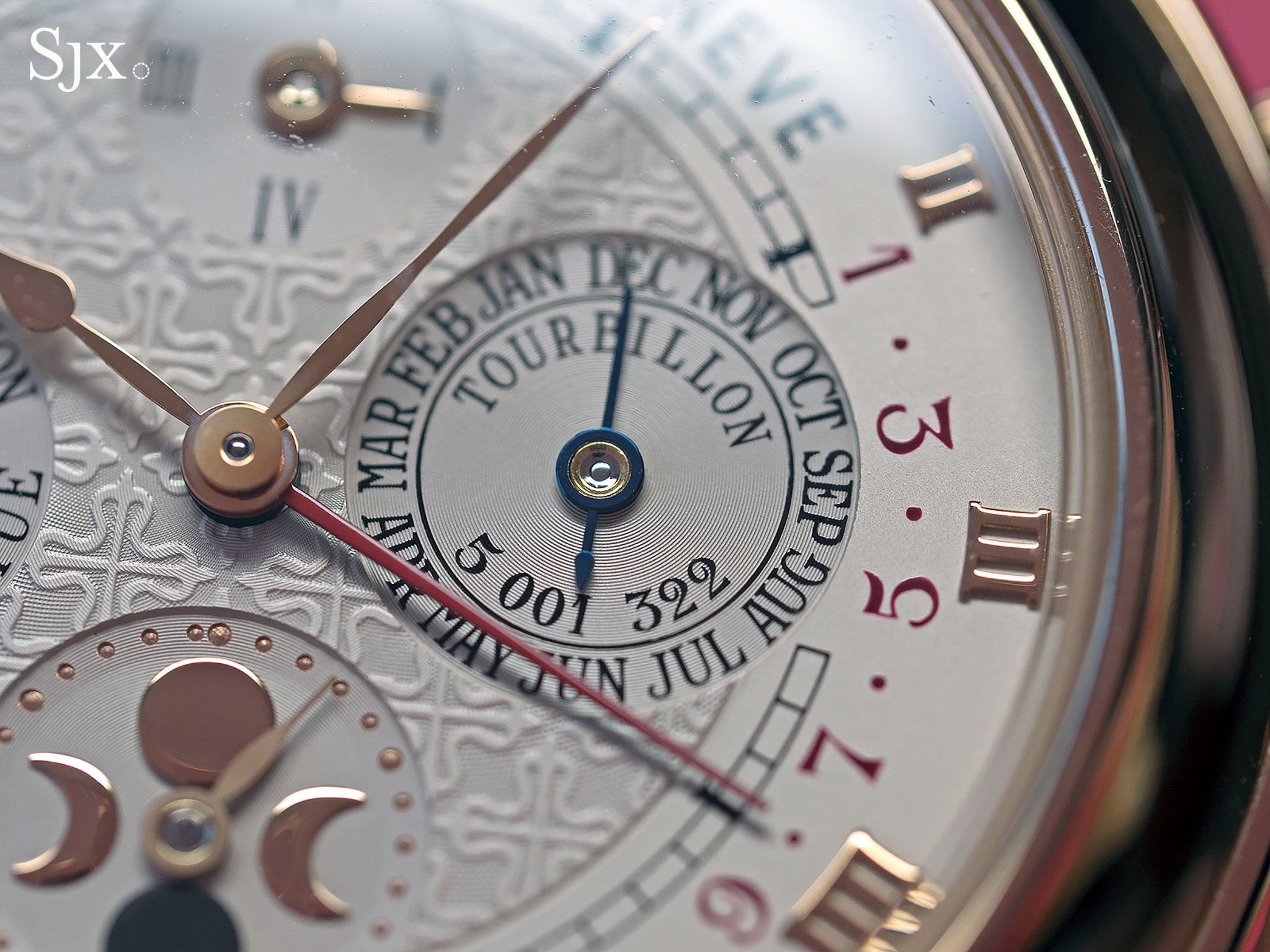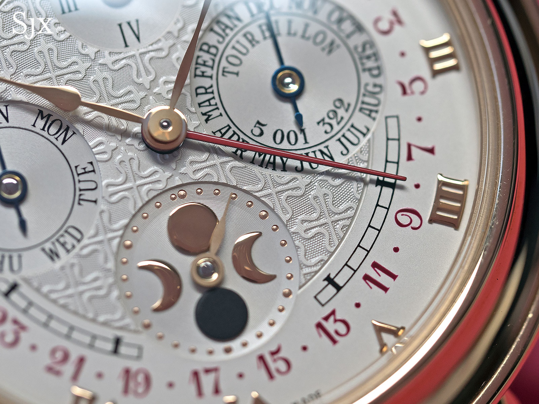A/ SKY MOON TOURBILLON with caliber R TO 27 QR SID LU CL (note that the date is indicated by a retrograde hand sweeping over an arc between 2 and 10 o'clock, and not between 8 and 4 o'clock).