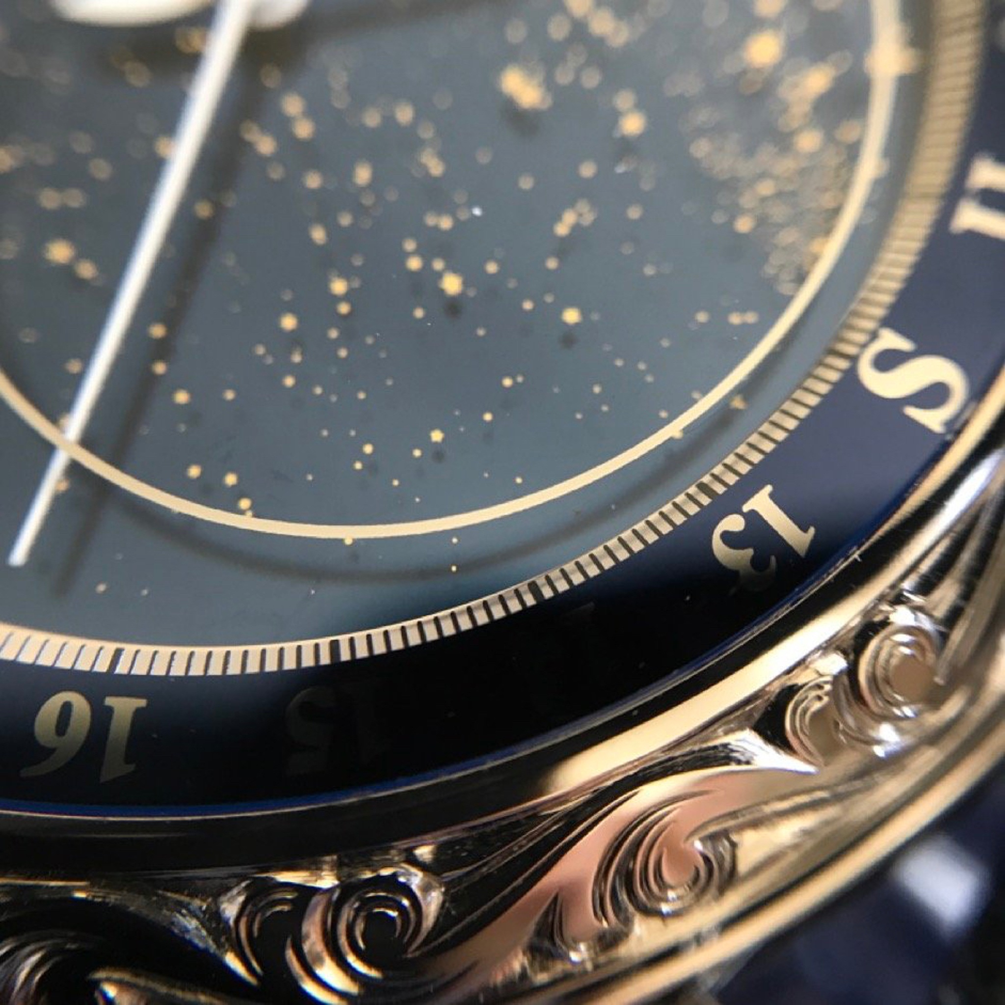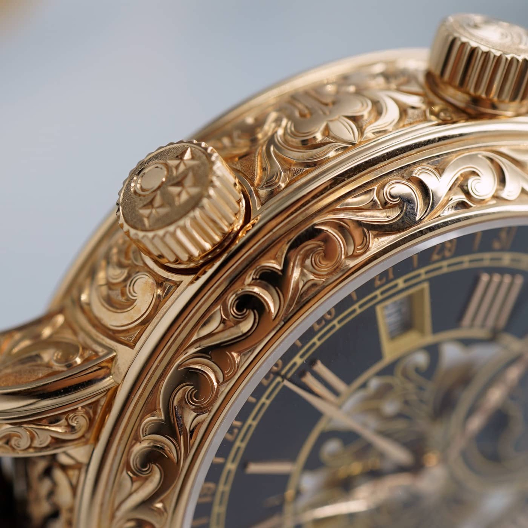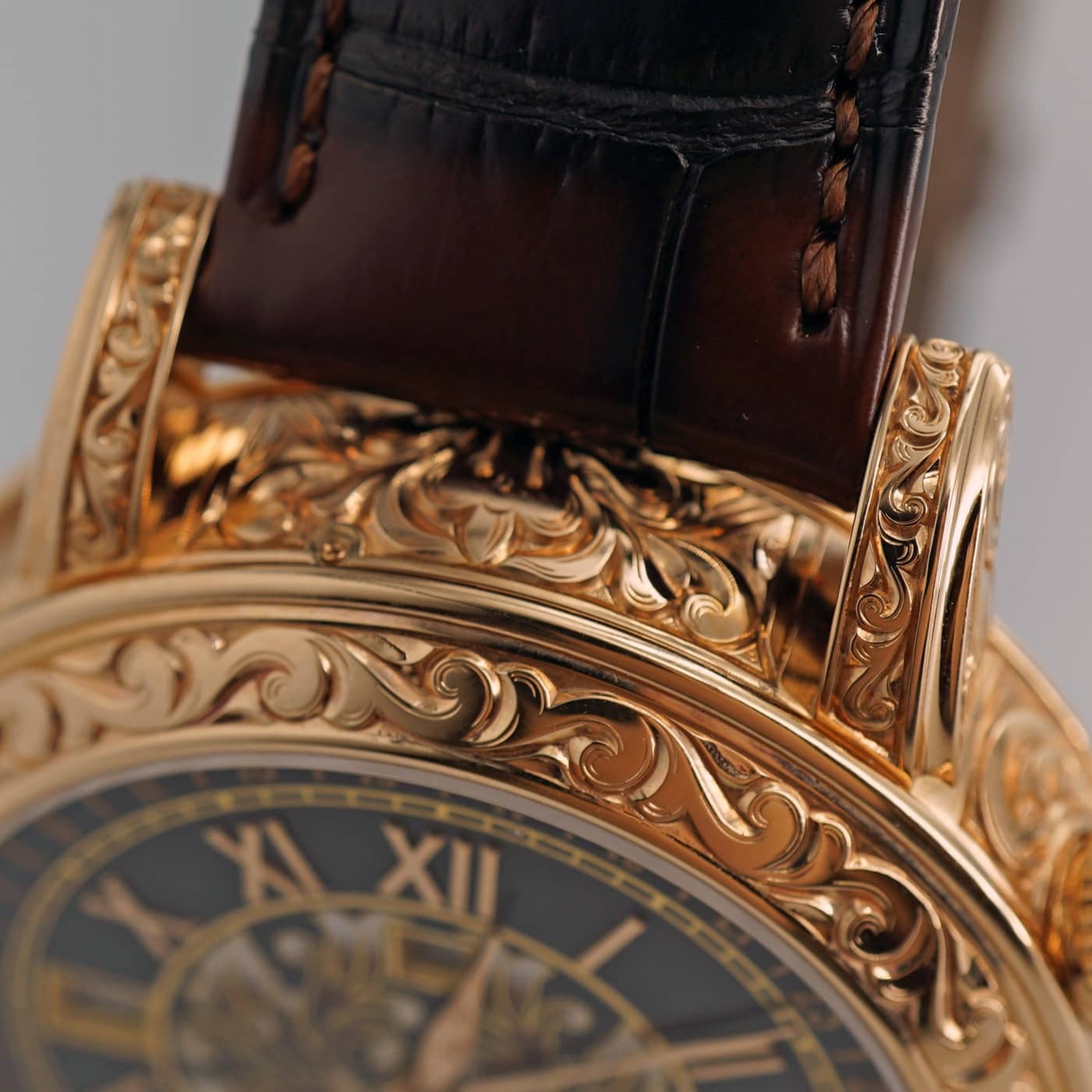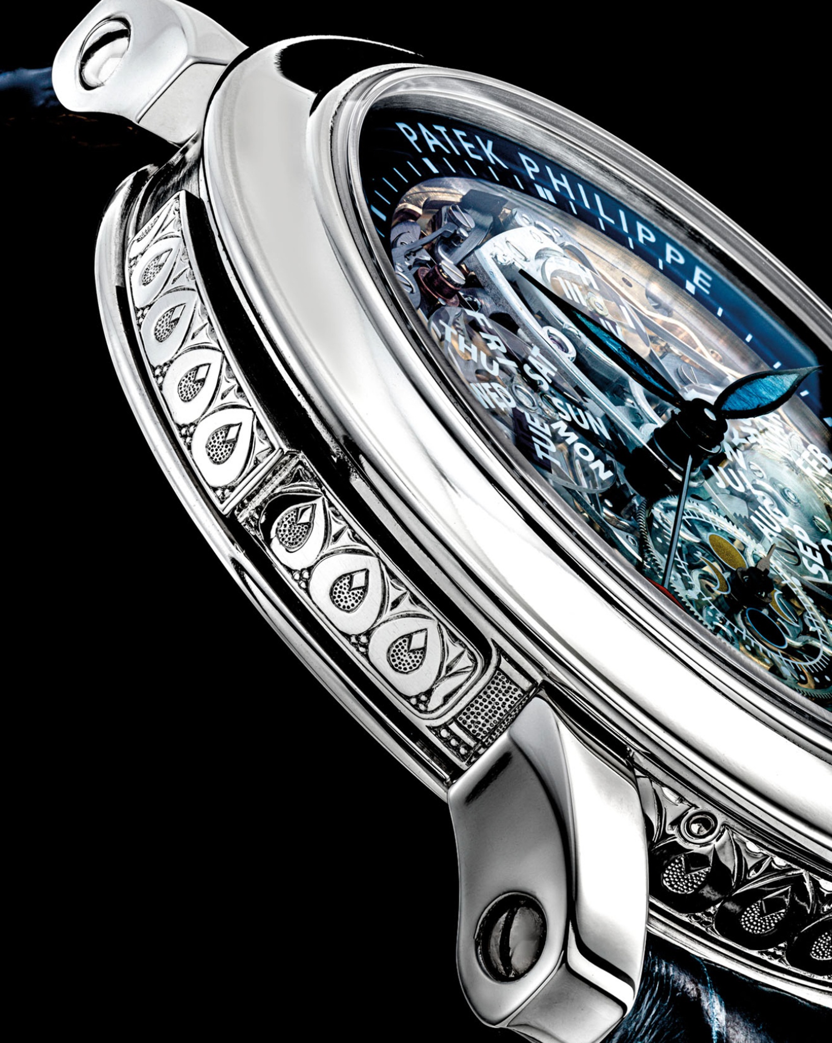 The watch features an elaborately hand-engraved case, typically crafted from precious metals, which houses a highly sophisticated manual-wind movement. The front dial displays traditional timekeeping along with perpetual calendar indications and a moon phase, while the reverse side is dedicated to astronomical displays including a sidereal time, sky chart, and the trajectory of the moon. The crystal protecting these intricate dials is sapphire, ensuring clarity and durability.