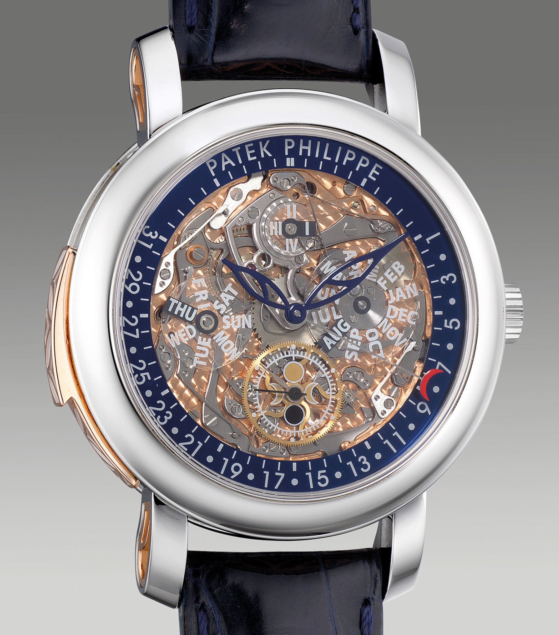 The watch features a platinum case, allowing for a substantial feel on the wrist while housing the self-winding mechanical movement. The skeletonized design extends to the dial, revealing the inner workings of the caliber, which includes a minute repeater with cathedral gongs. The perpetual calendar displays are integrated into this open architecture, providing day, date, month, and leap year indications. The sapphire crystal on both the front and back ensures durability and an unobstructed view of the movement.