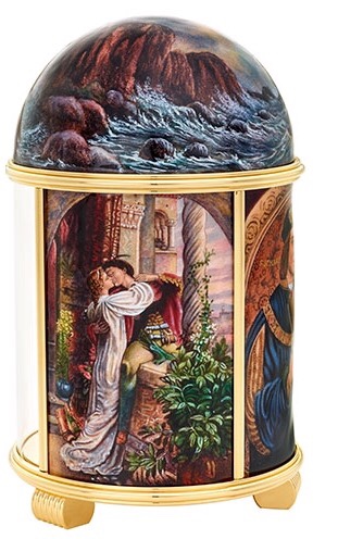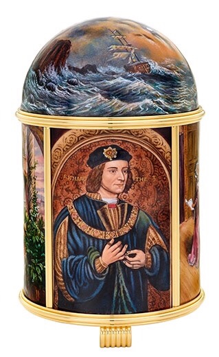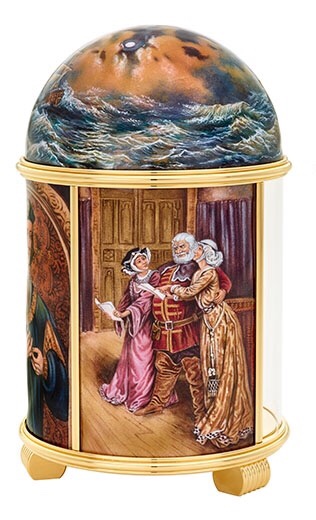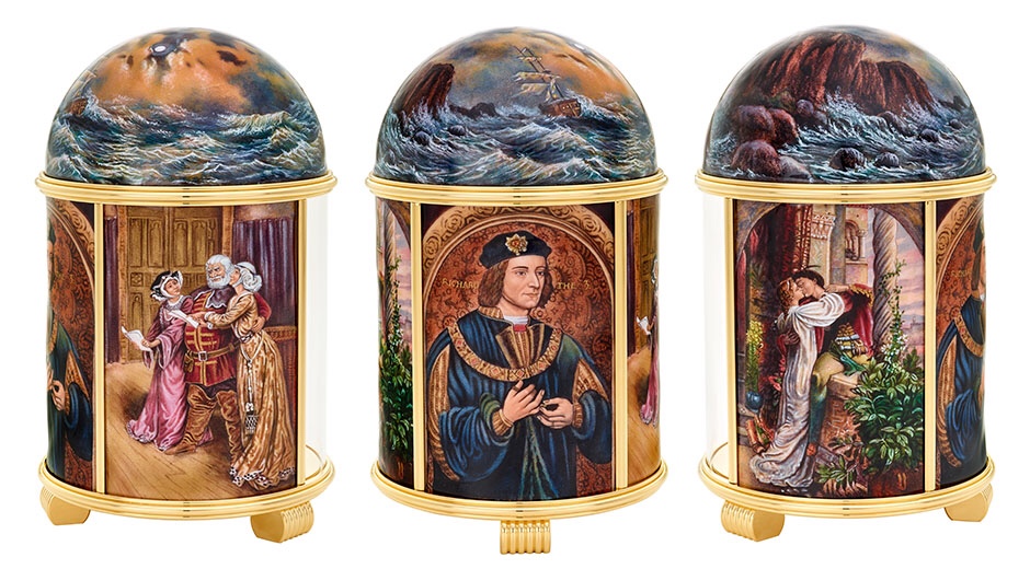 Created using the ancient technique of Limoges painted enamels, the Patek Philippe Shakespeare Commemorative Dome Clock features three main panels, each depicting one of Shakespeare’s most beloved works. Representing the comedies, the Merry Wives of Windsor illustration is drawn from a picture completed in 1902 by Charles Buchel for Herbert Beerbohm Tree’s coronation revival. A portrait of Richard III, representing the historical plays, is featured on the rear panel. The third panel symbolises the tragedies with no other than Romeo and Juliet. This is based on an original painting by Frank Bernard Dicksee, voted the most romantic artwork in Britain.