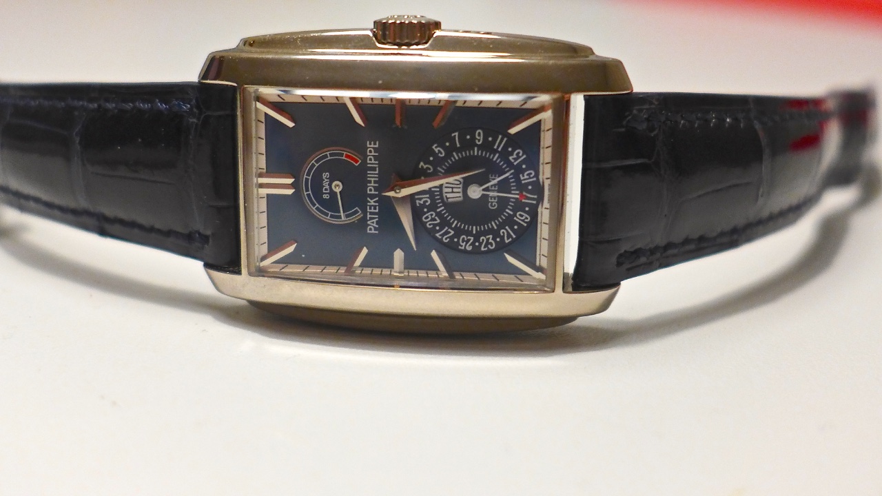 The rectangular case has a fairly generous size: 46.90 by 32.40 mm and a thickness of 11.63 mm. The two-tiered mirror polished flanks give the watch a very distinctive Art Deco style look but slightly understated compared to its two prestigious predecessors. The white gold case has an anatomical arched profile providing an optimal wearing comfort. The screwed case back incorporates an anatomically contoured sapphire-crystal insert whilst the crystal protecting the dial is ground to a convex shape that follows the silhouette of the case. The dial is in the same spirit as 5100 with a well-balanced distribution between the auxiliary dials for the power reserve and the small second. The dial is available in blue sunburst or silvery white. I have a clear preference for the blue dial.