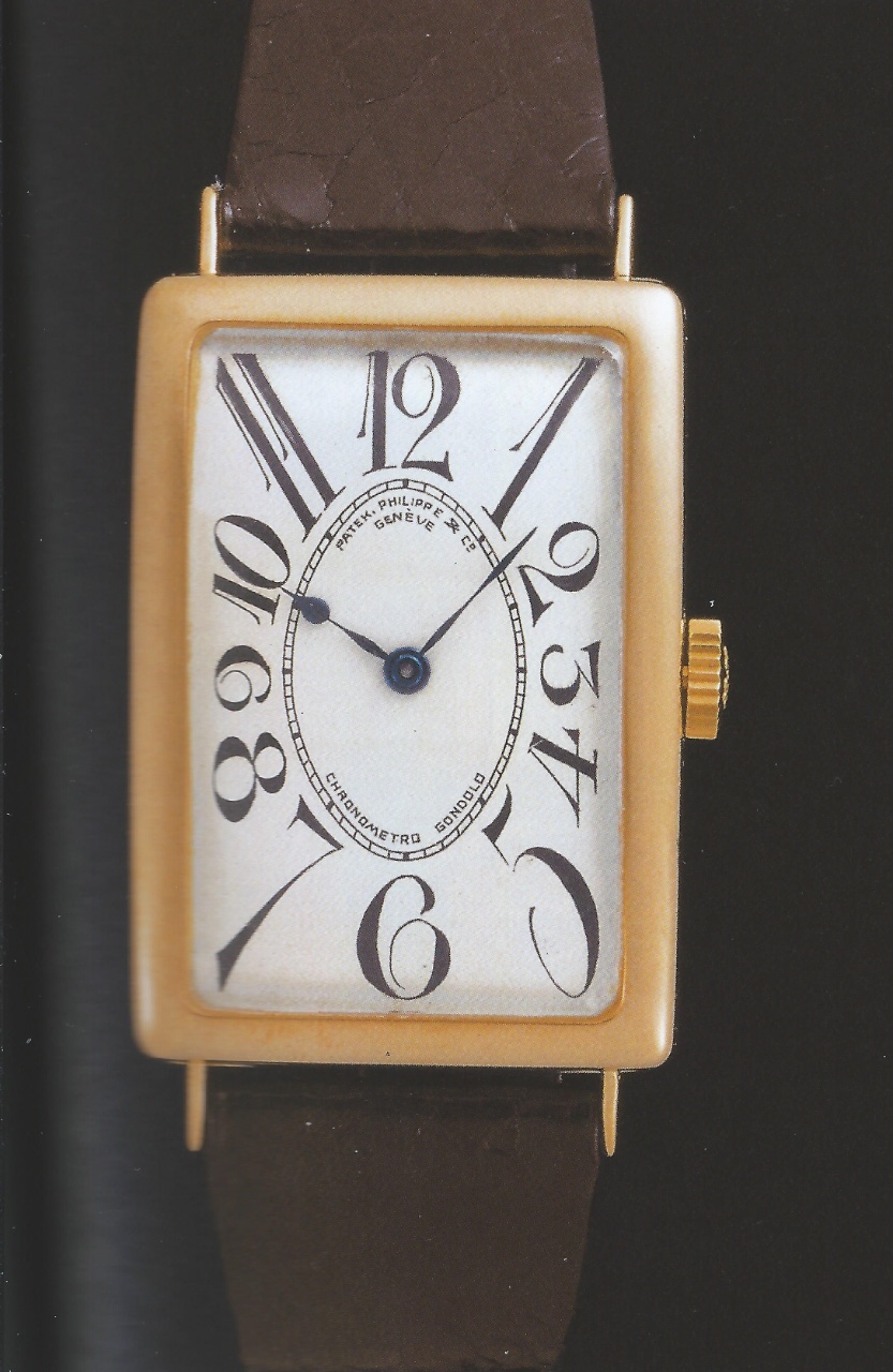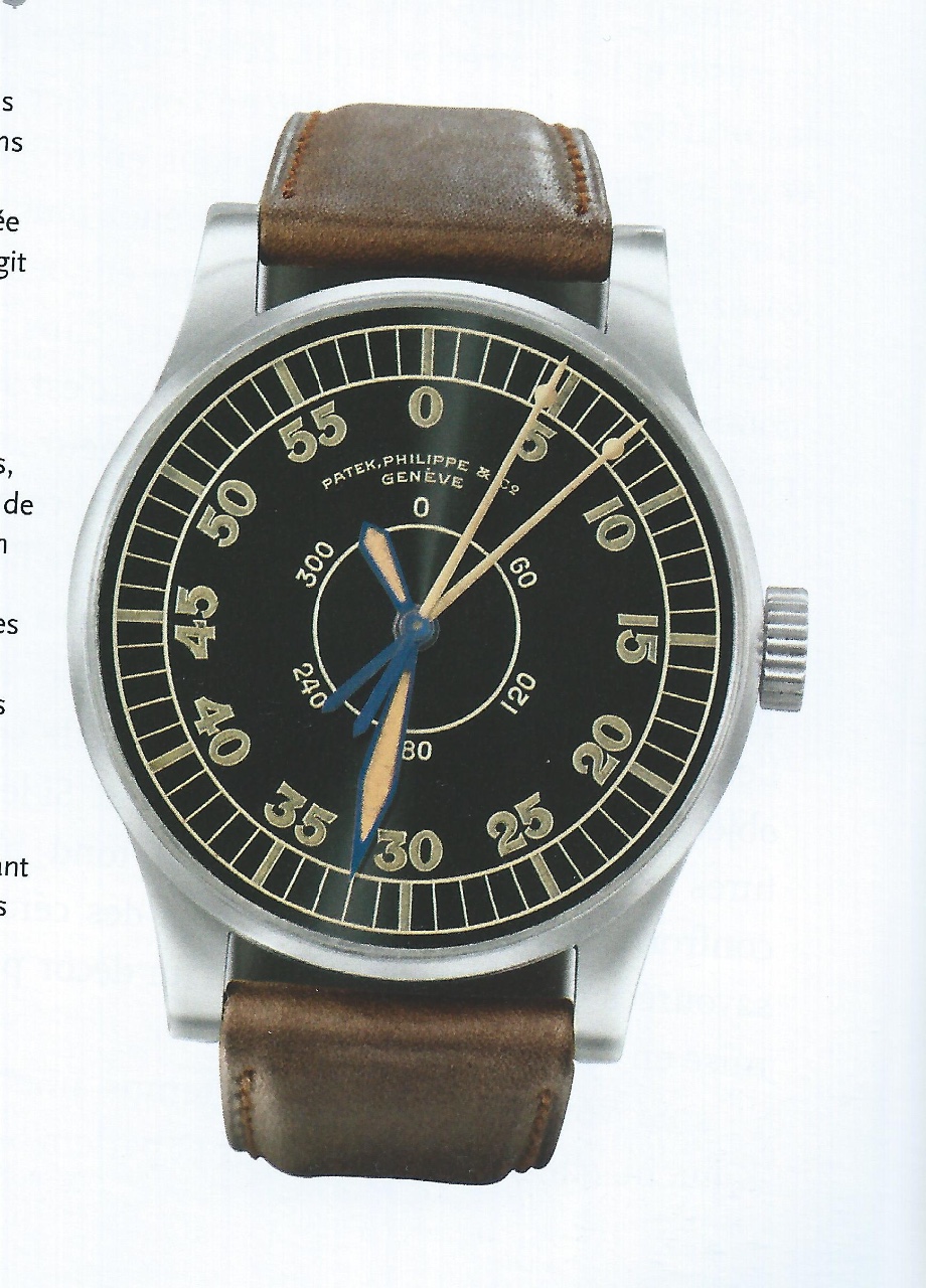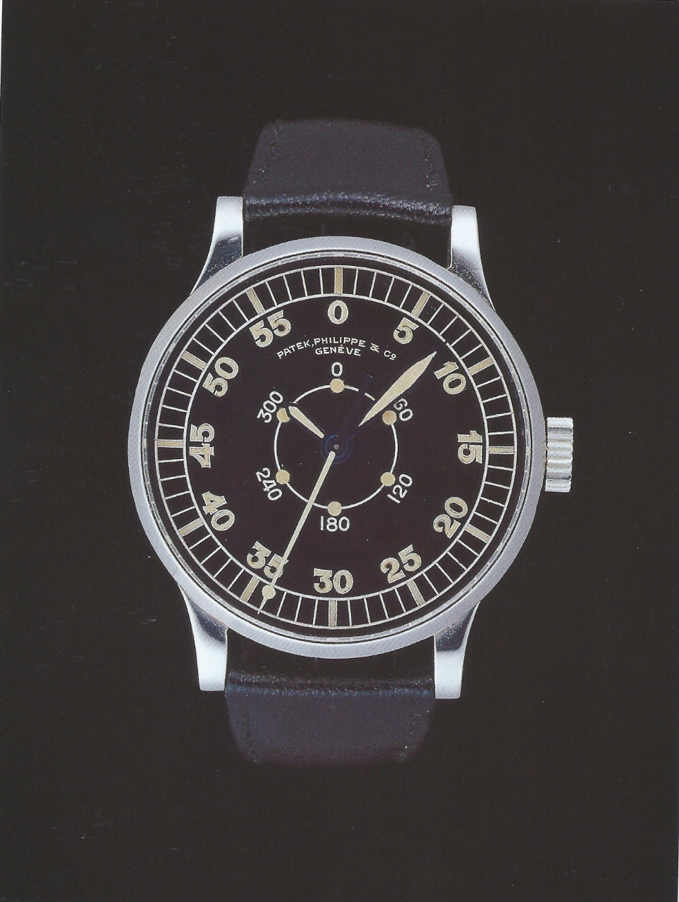 The first aviator watch is an hour angle wristwatch with black dial and fitted with simple centre seconds hand only, is extensively described and illustrated in the Huber & Banbery book (pp. 252 & 253). Sold at public auction in 1991, it is now on permanent exhibit at Patek Philippe Museum.