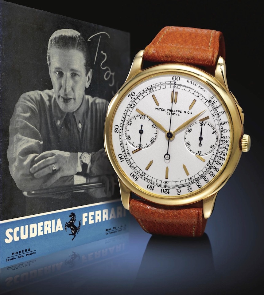 This yellow gold oversized monopusher chronograph was produced in 1932 on special order for Carlo Felice Trossi, the president of the Scuderia Ferrari. In the below picture, we see Carlo Felice Trossi wearing this 46 mm single button chronograph on his sleeve, where he presumably wore it for the benefit of easier access as he was timing laps. Sotheby’s sold the watch in May 2008 for $2.24 million.