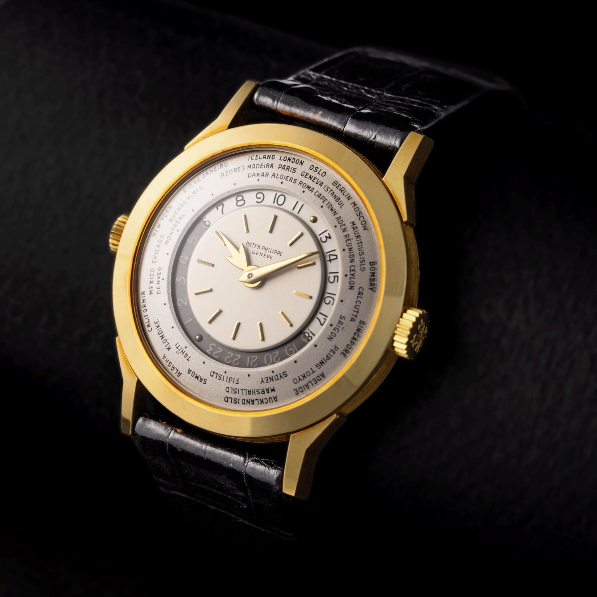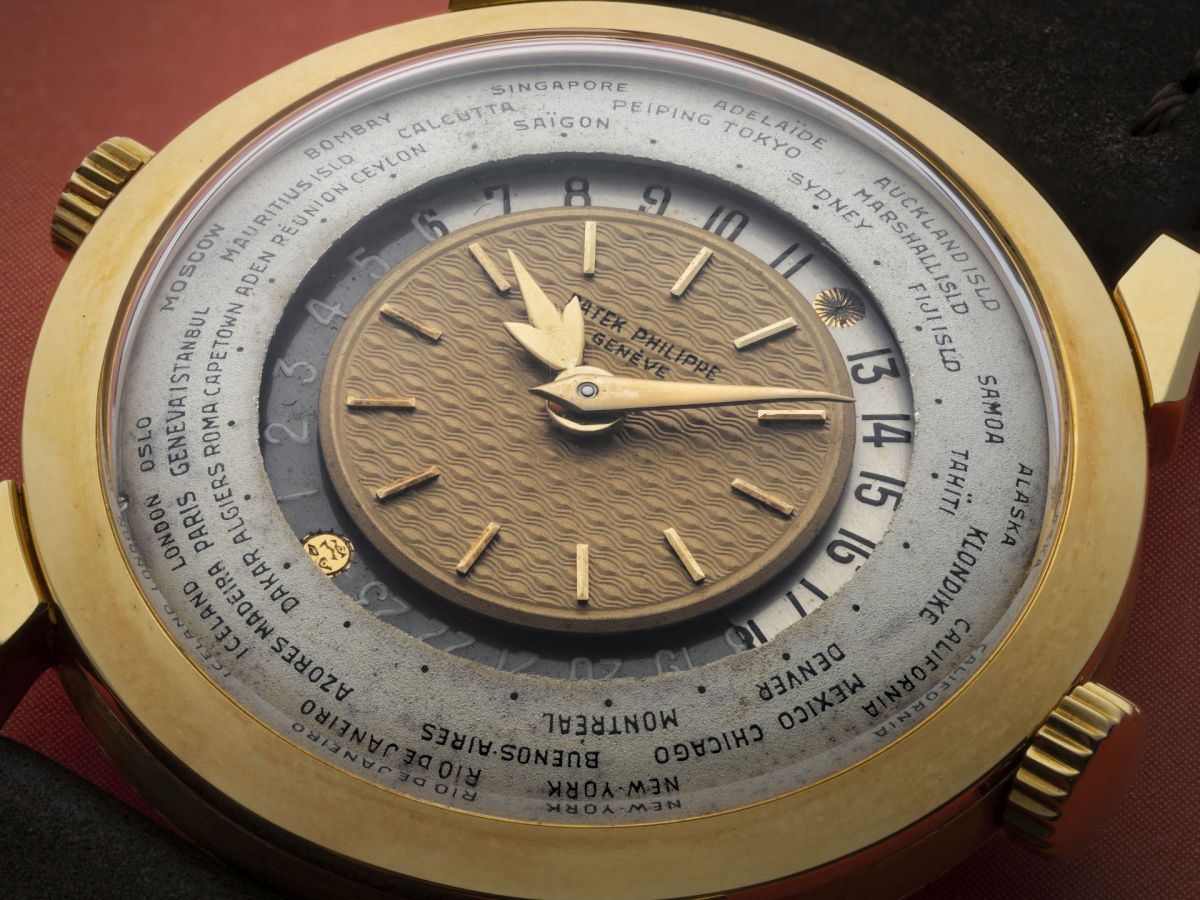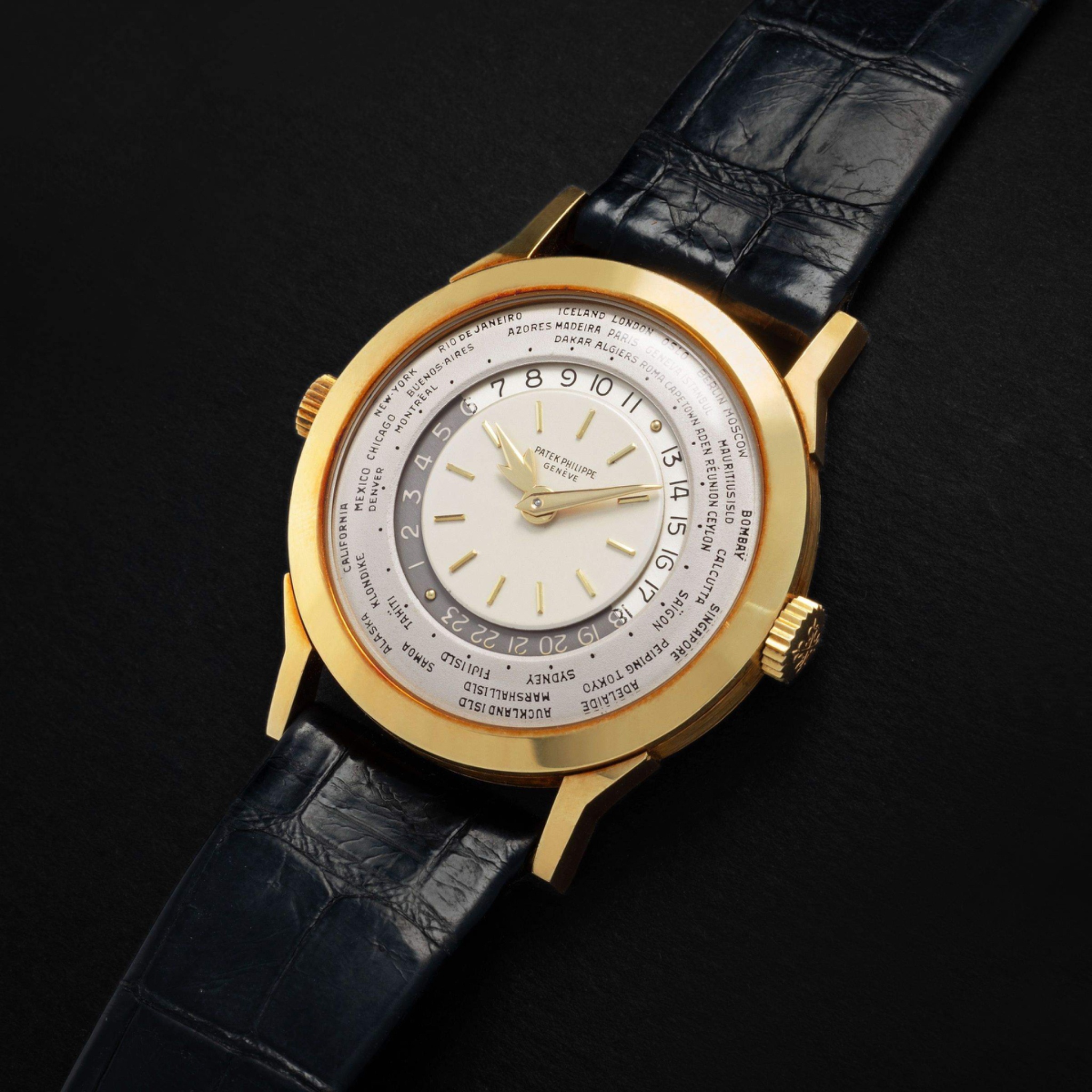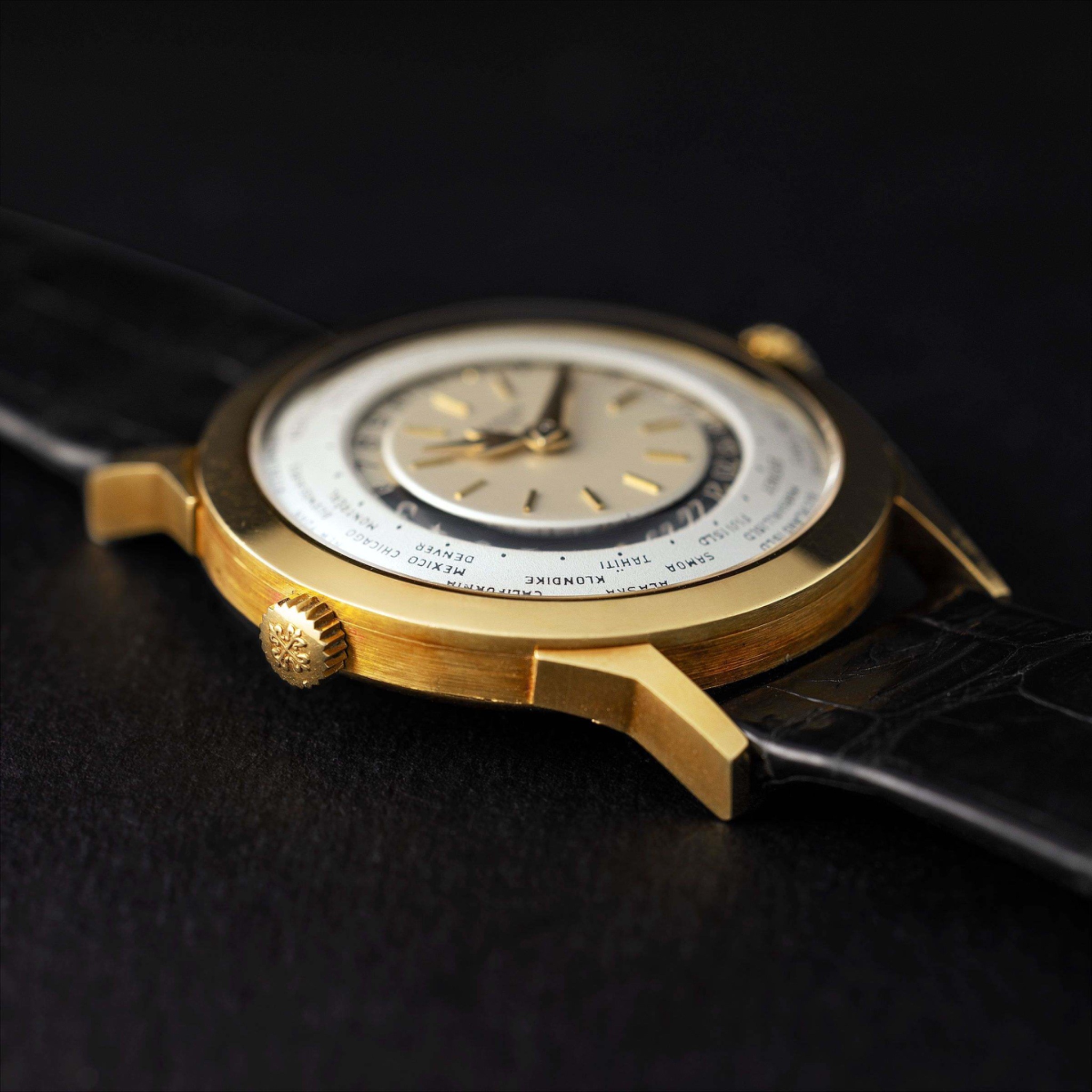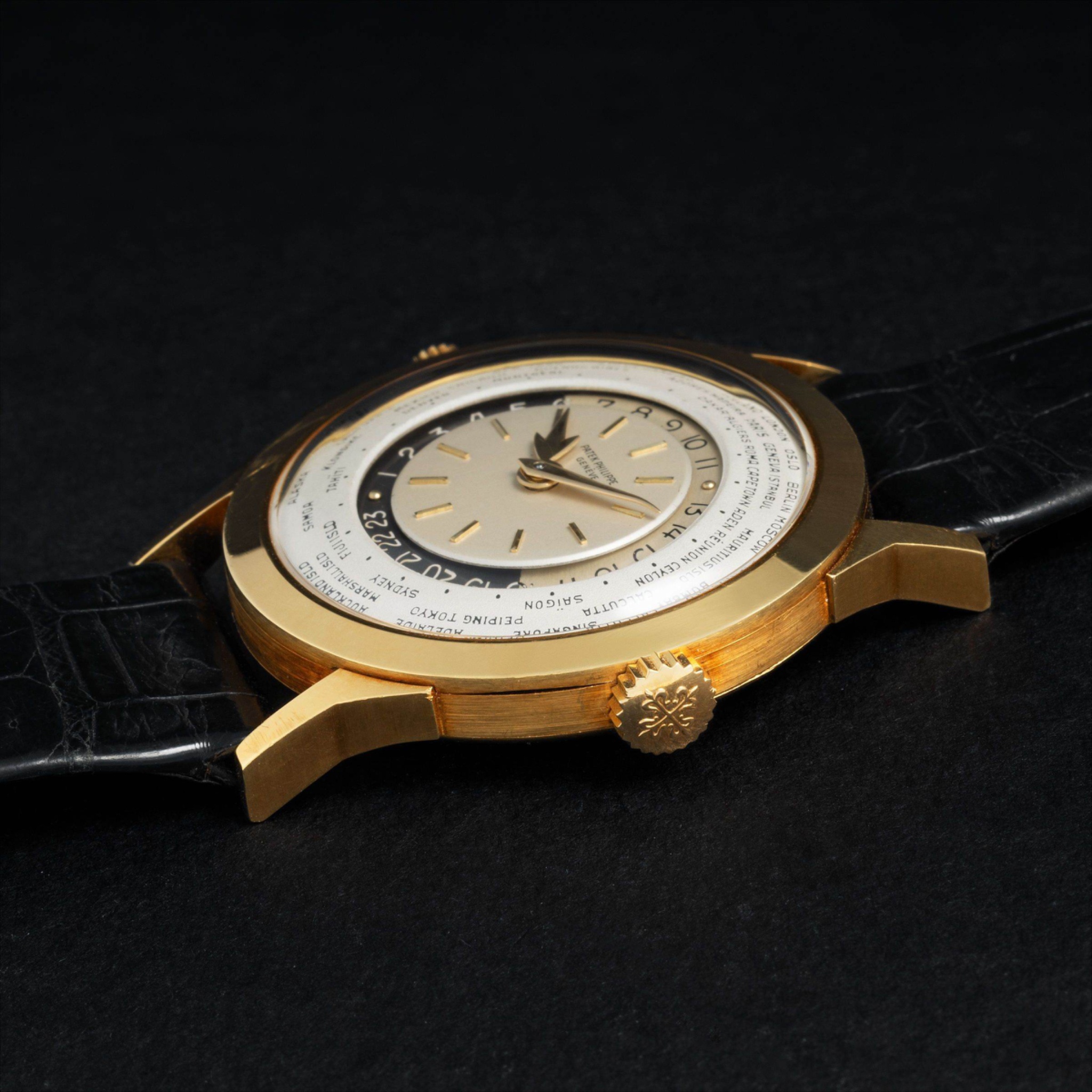 Launched in 1953, the Patek Philippe World Time ref. 2523 featured a new two-crown system, one for winding the watch and the other at 9 o’clock controlling the city disc.