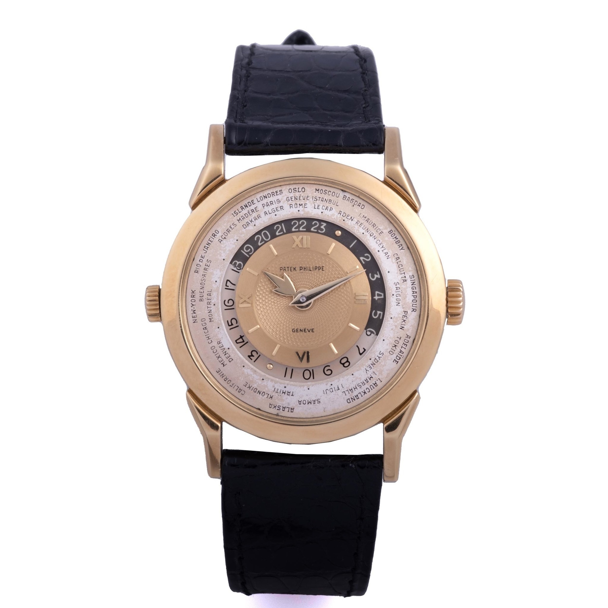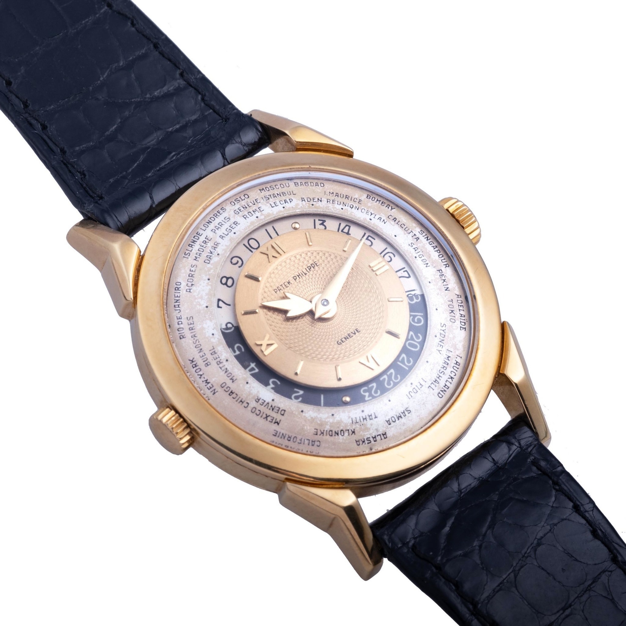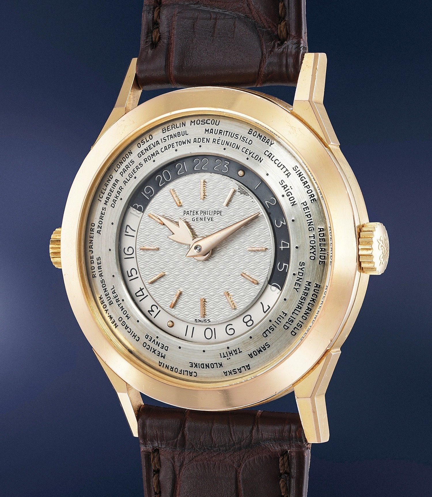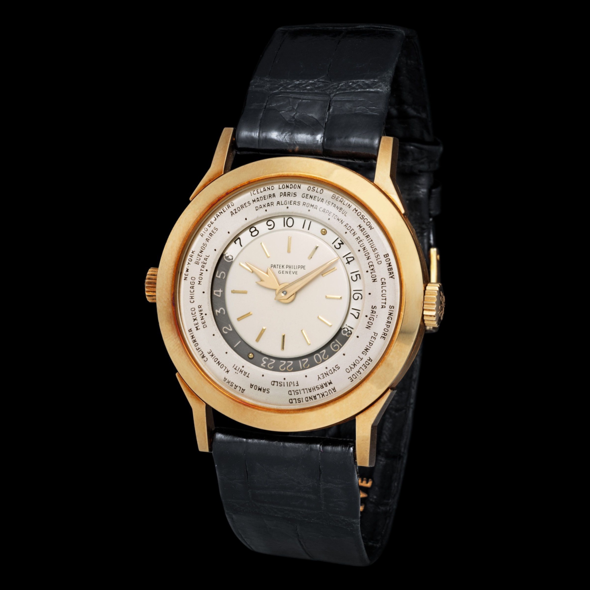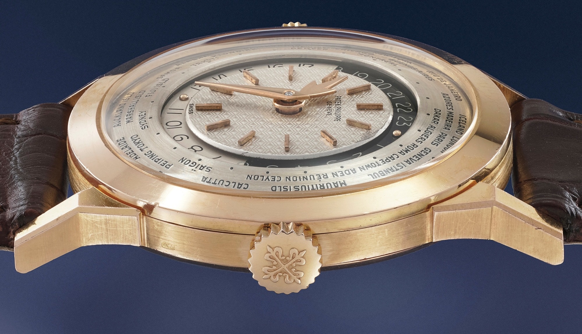 Launched in 1953, the Patek Philippe World Time ref. 2523 featured a new two-crown system, one for winding the watch and the other at 9 o’clock controlling the city disc.