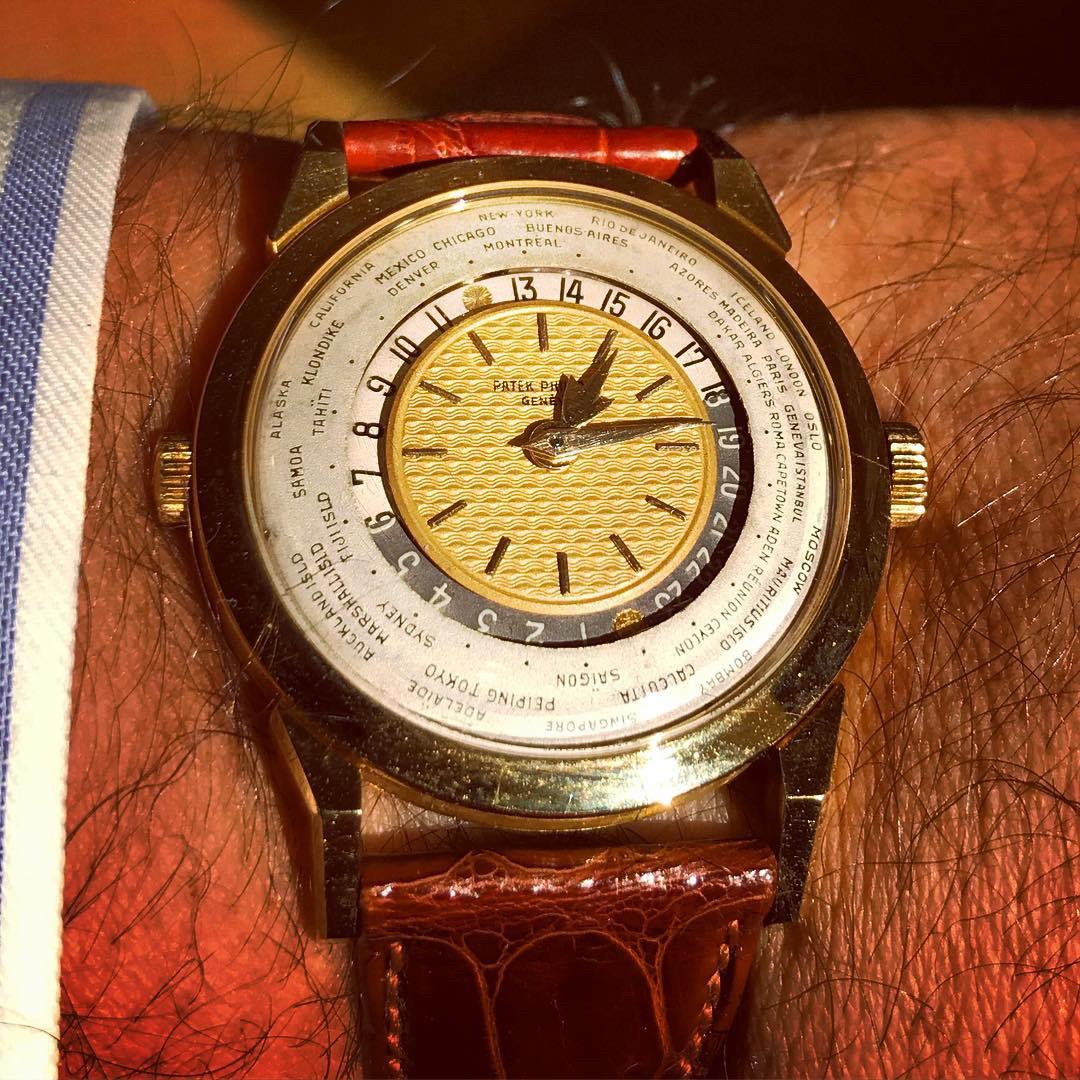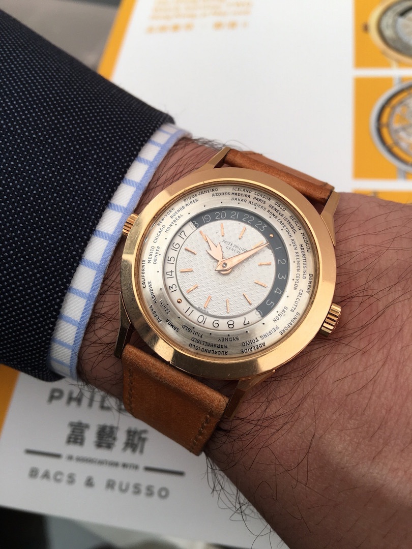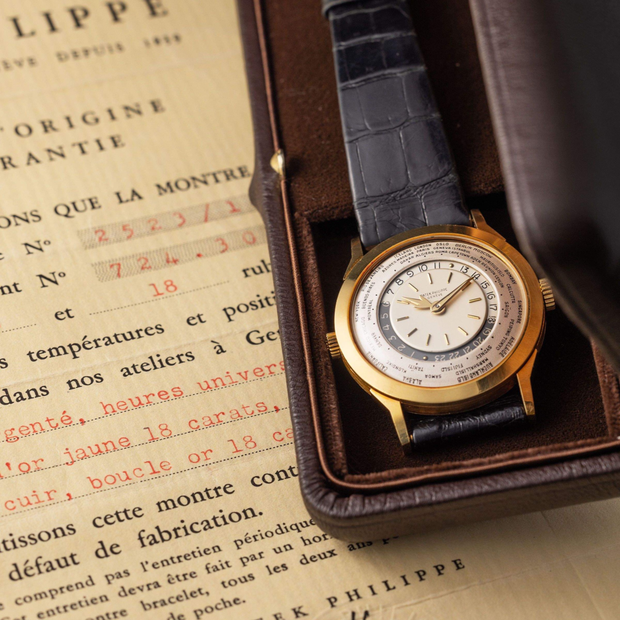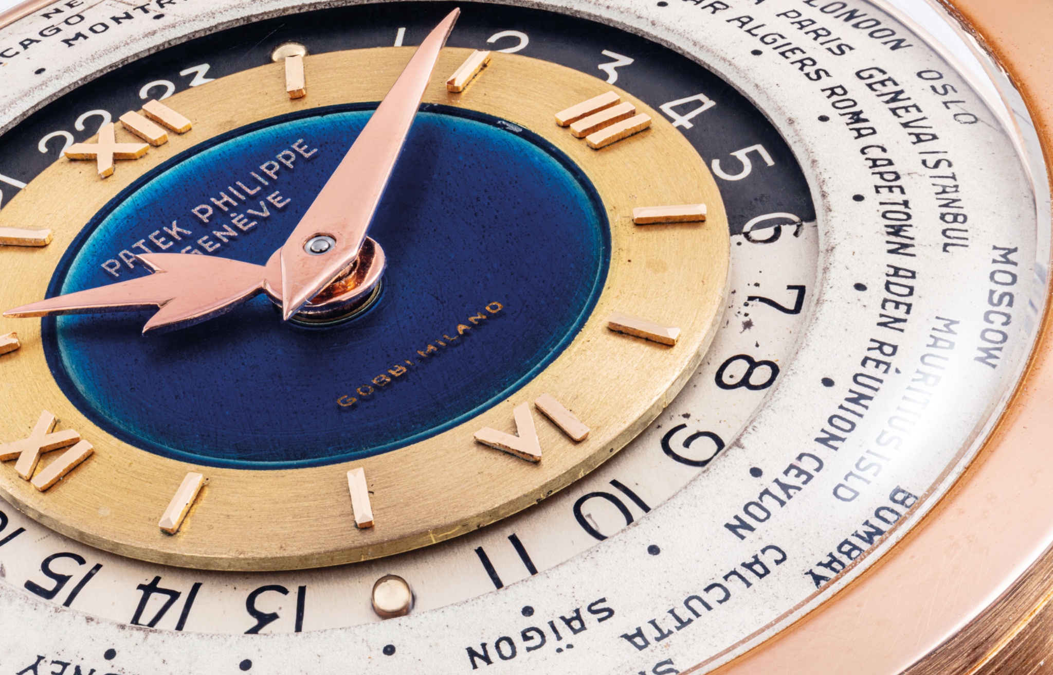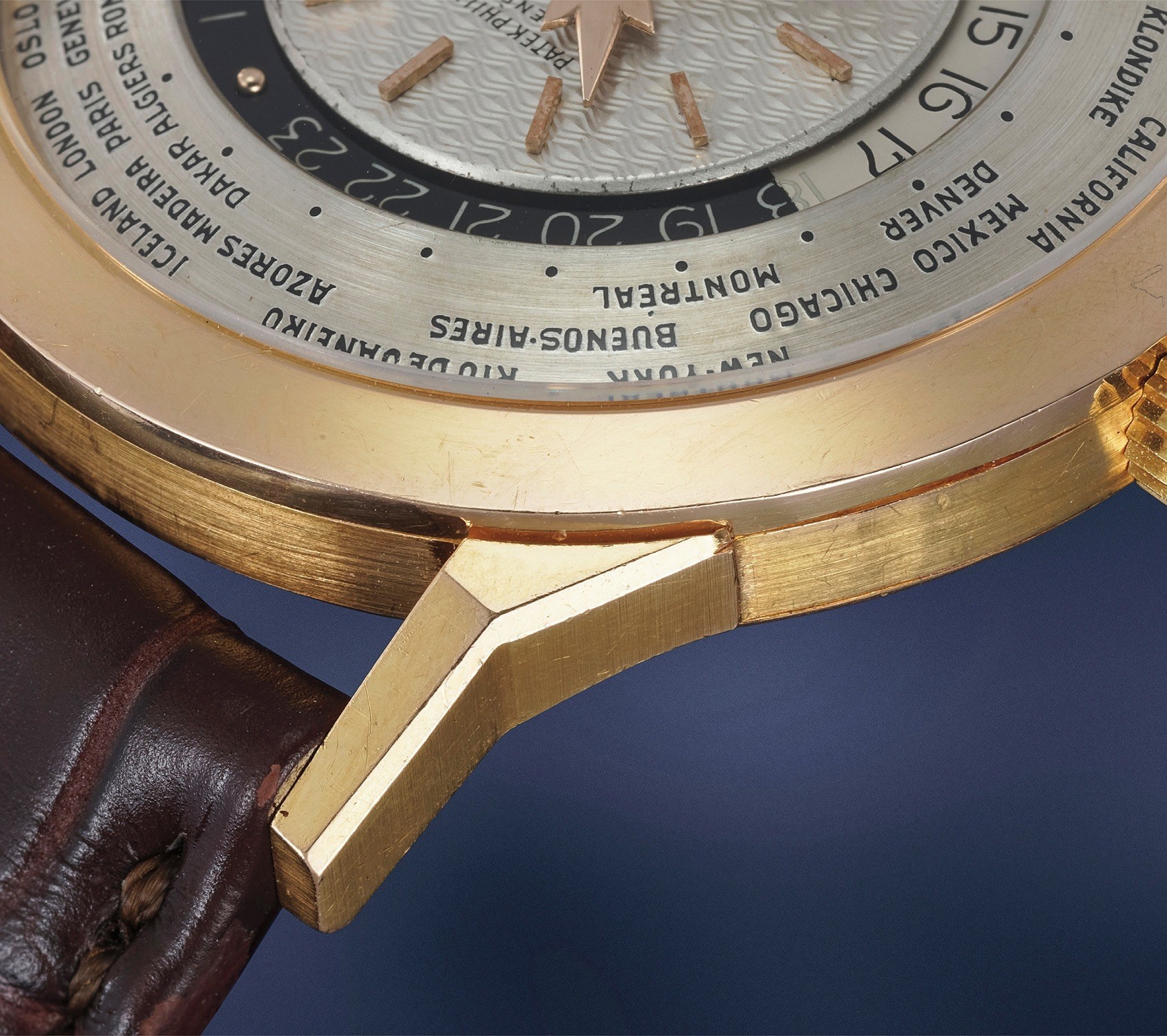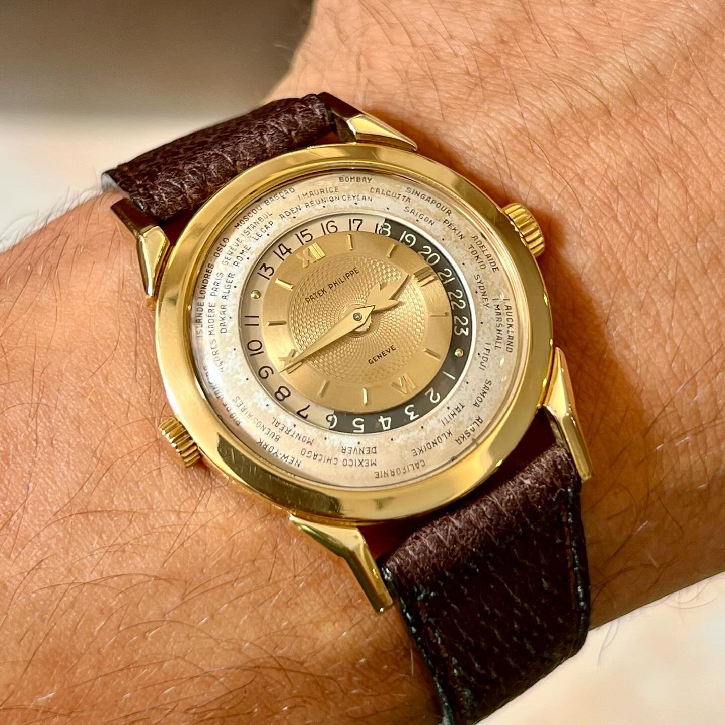 Launched in 1953, the Patek Philippe World Time ref. 2523 featured a new two-crown system, one for winding the watch and the other at 9 o’clock controlling the city disc.