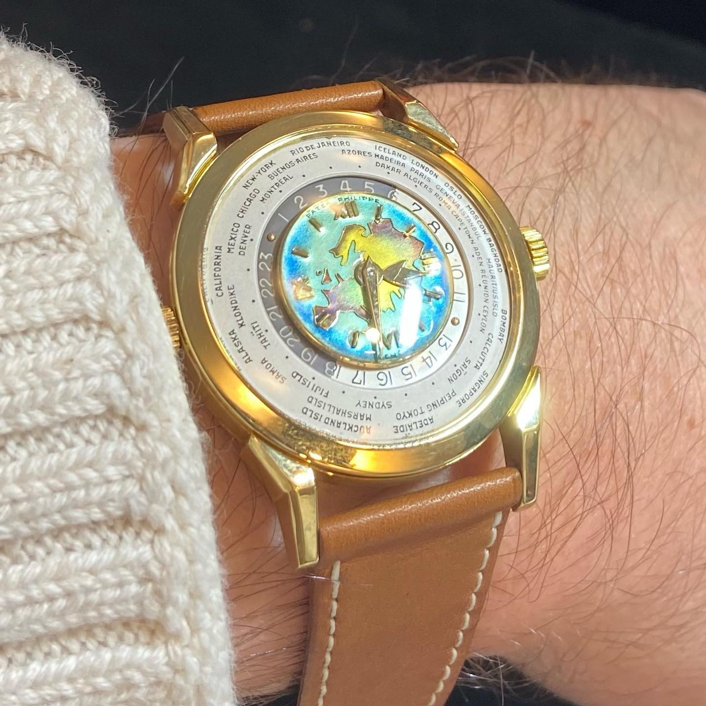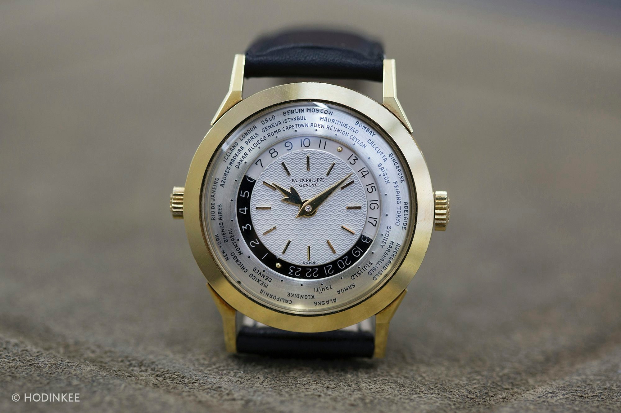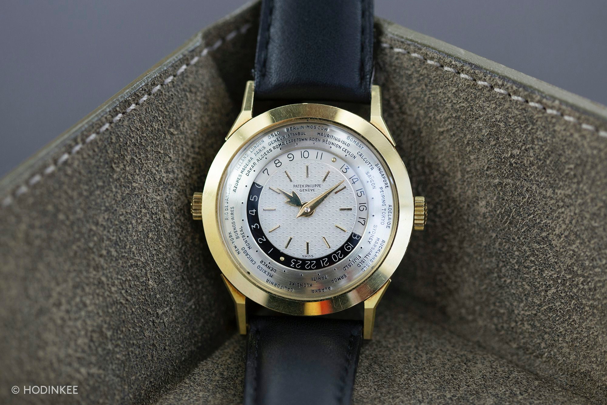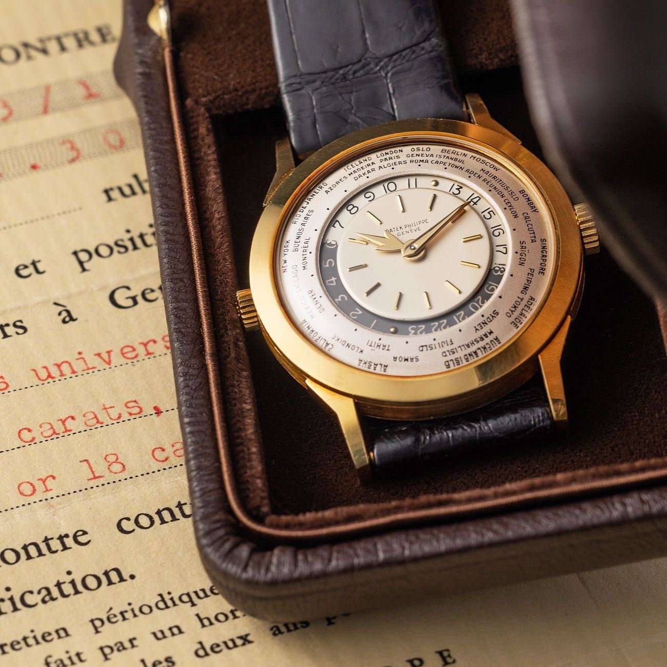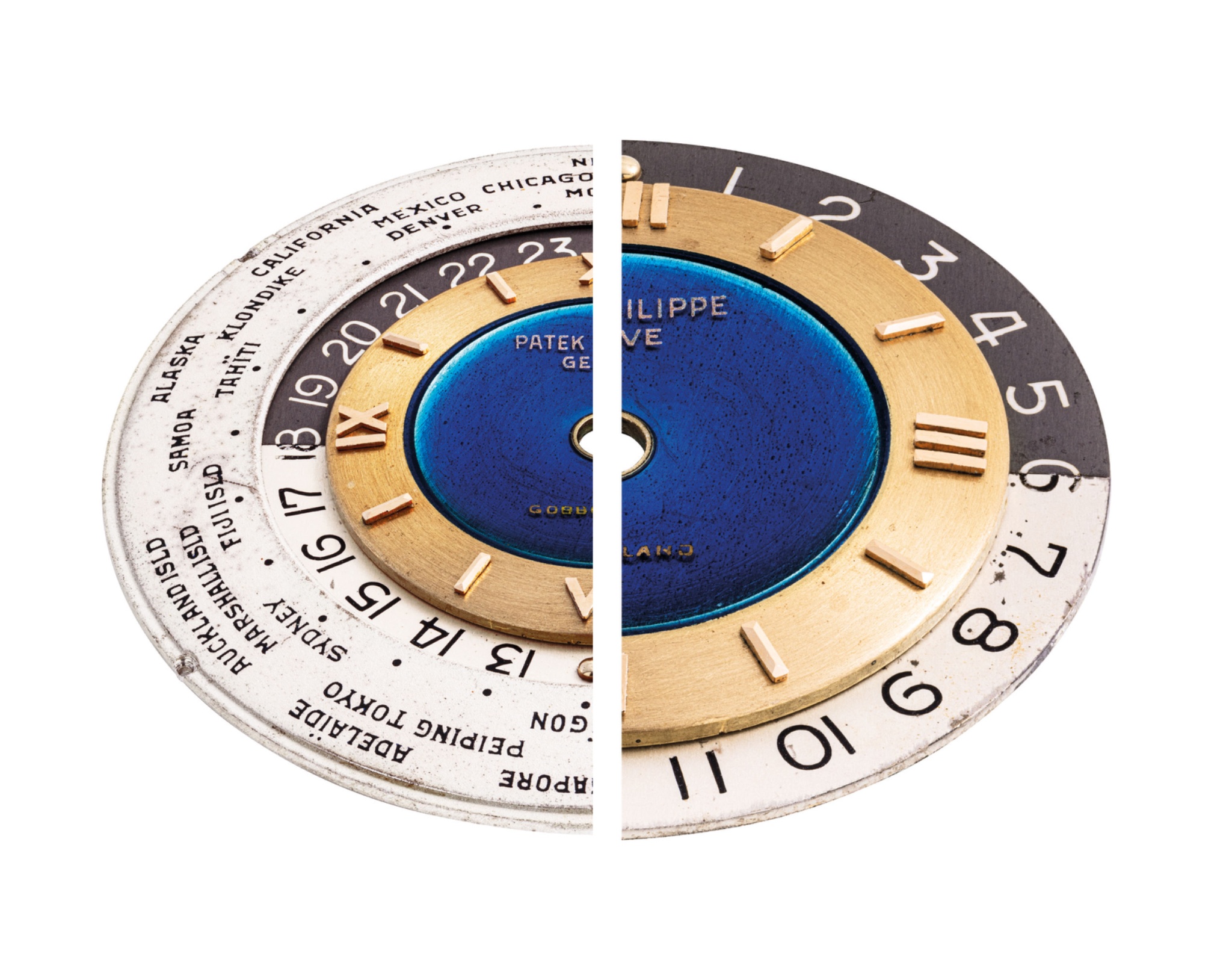Launched in 1953, the Patek Philippe World Time ref. 2523 featured a new two-crown system, one for winding the watch and the other at 9 o’clock controlling the city disc.