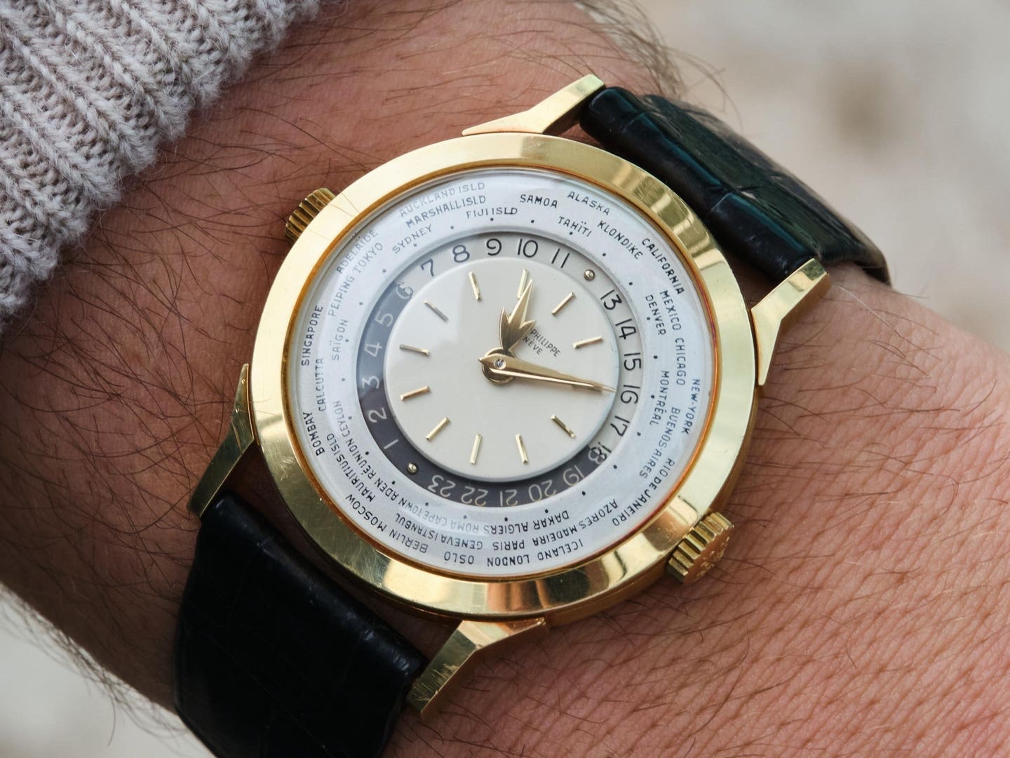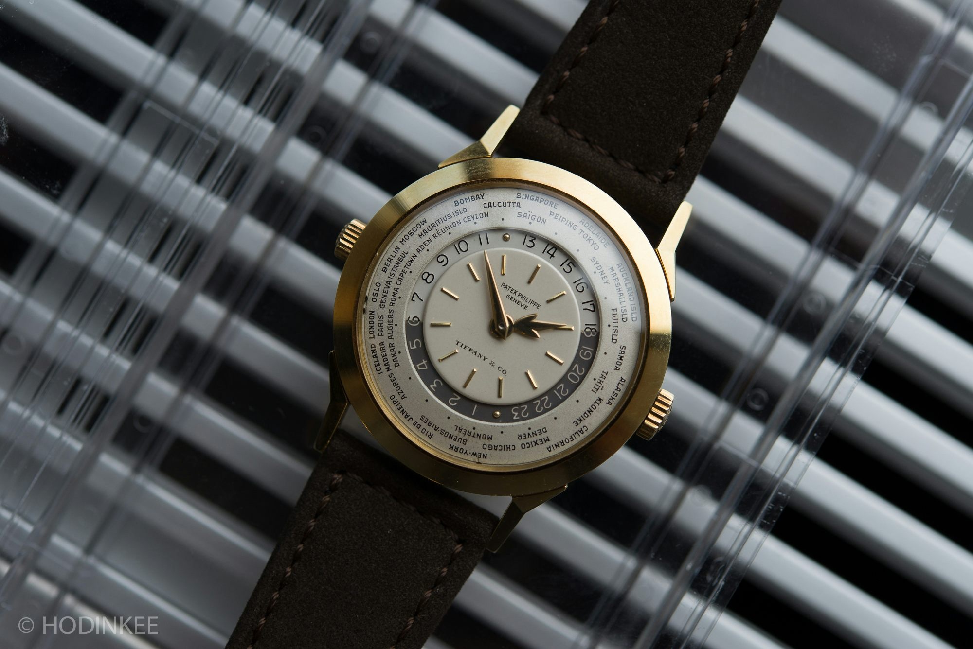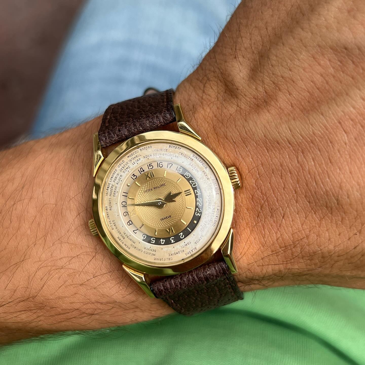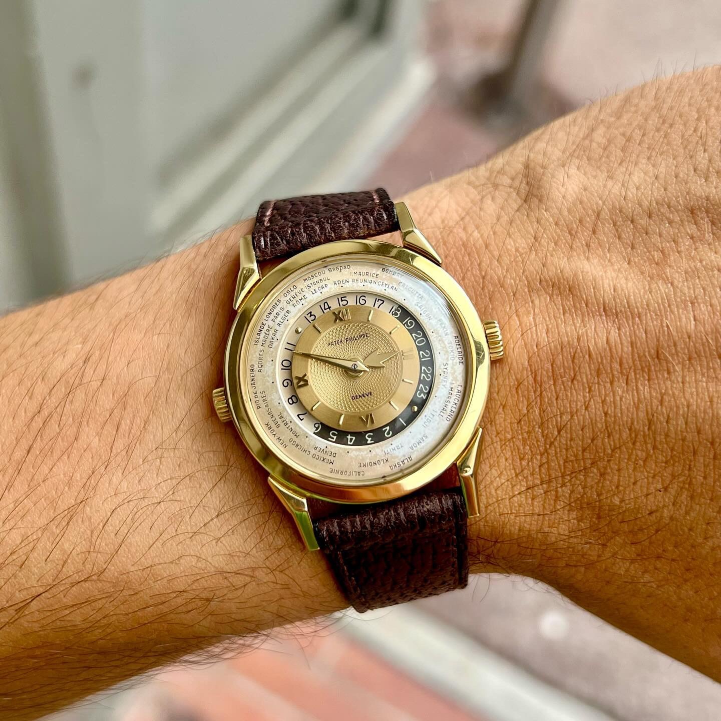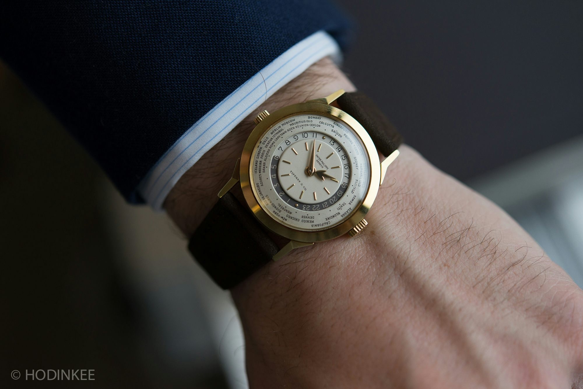 Launched in 1953, the Patek Philippe World Time ref. 2523 featured a new two-crown system, one for winding the watch and the other at 9 o’clock controlling the city disc.