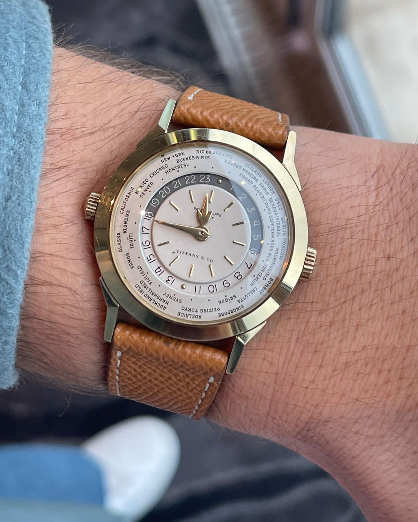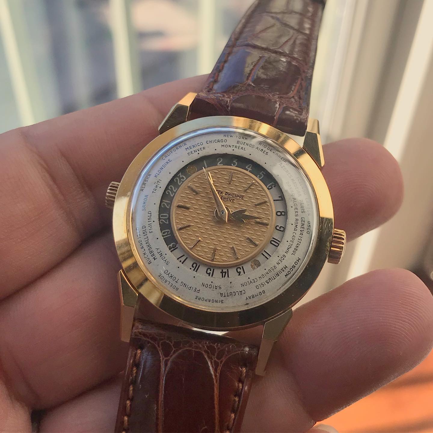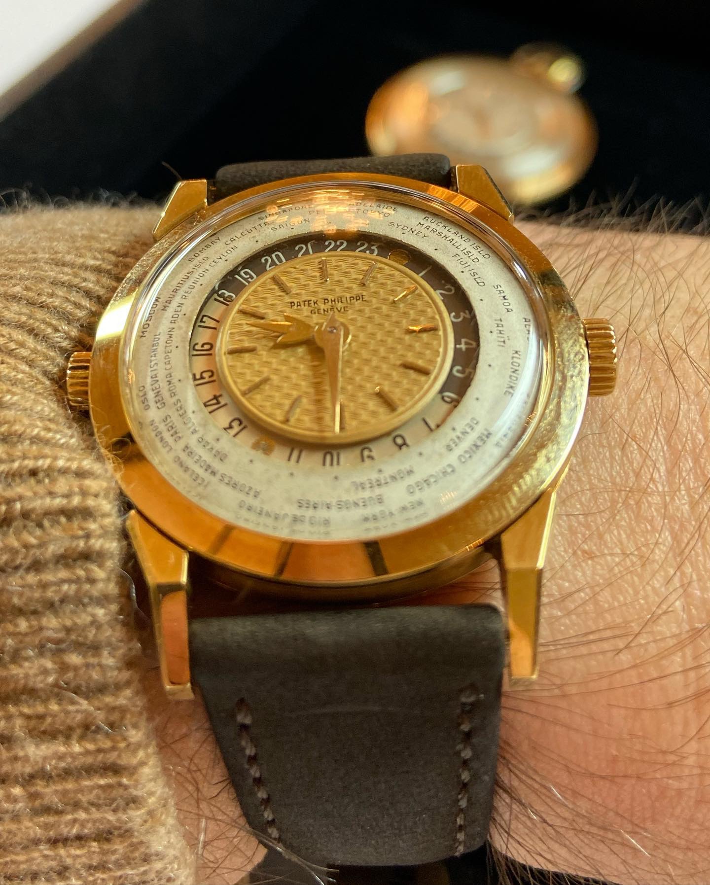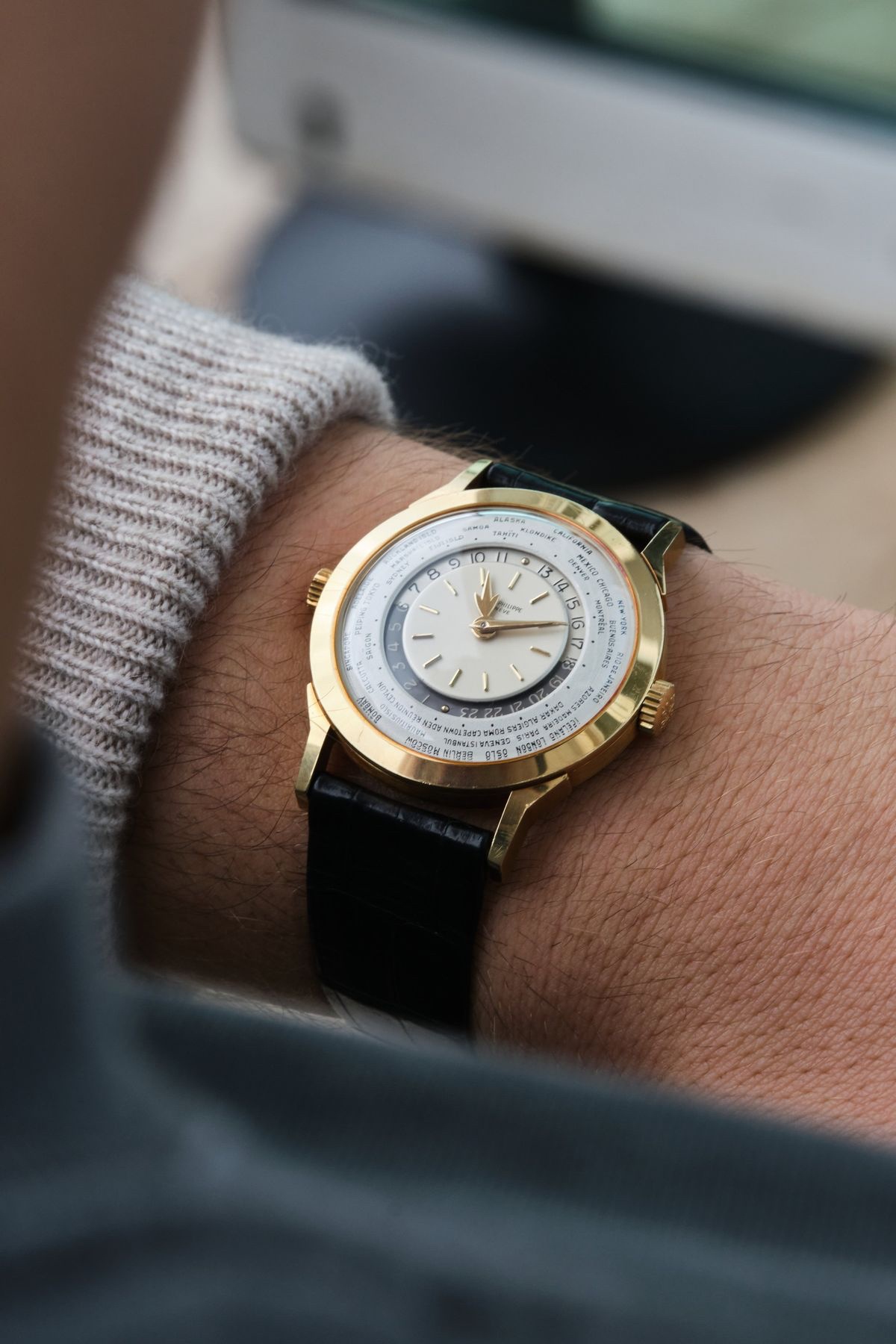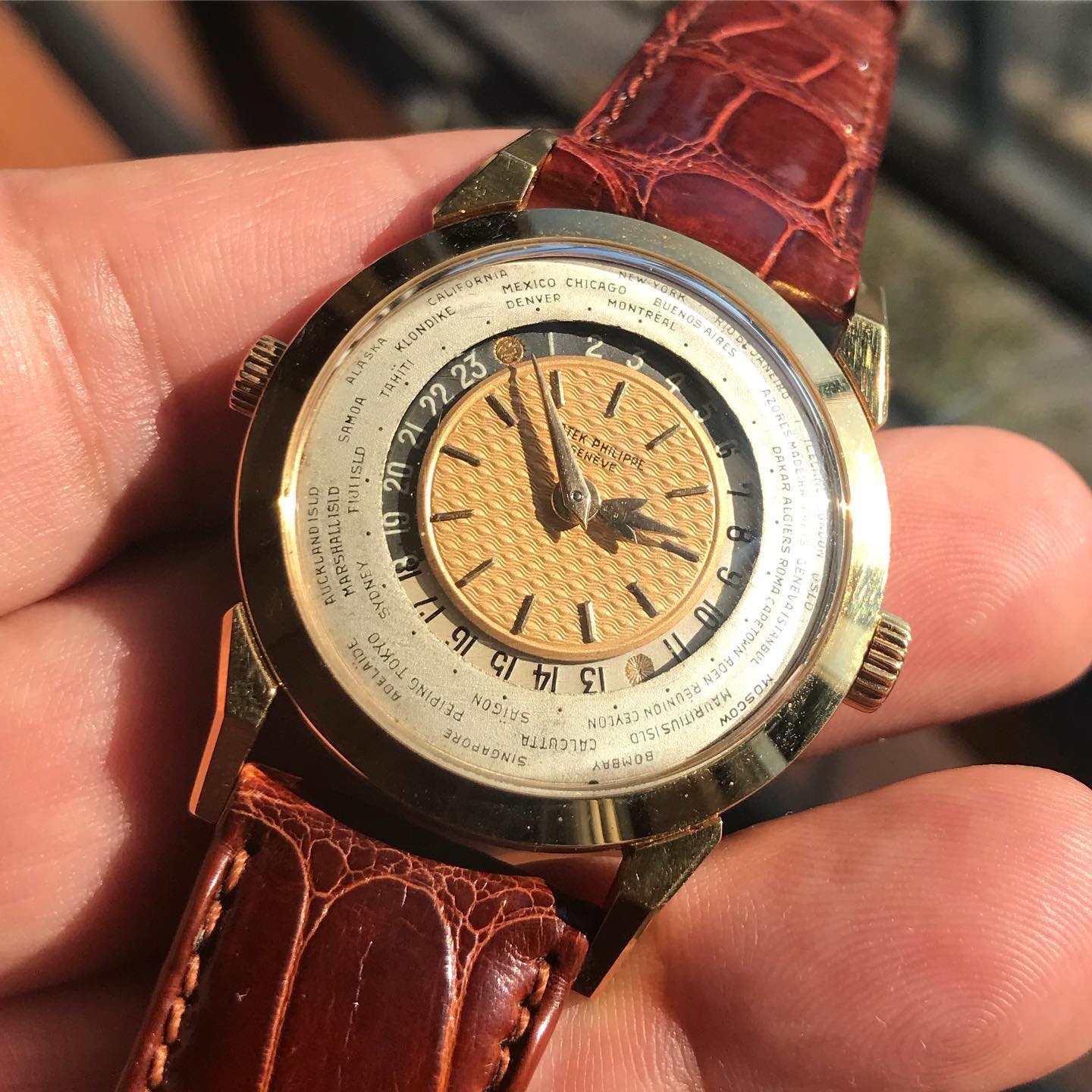 Launched in 1953, the Patek Philippe World Time ref. 2523 featured a new two-crown system, one for winding the watch and the other at 9 o’clock controlling the city disc.