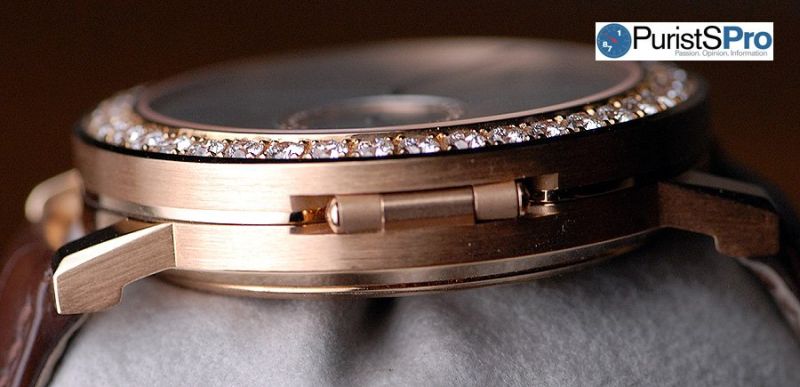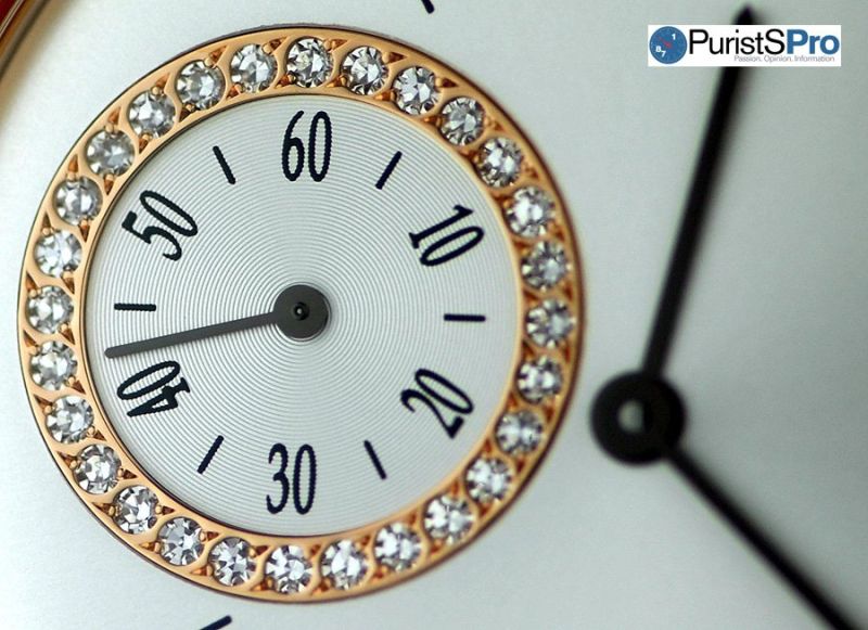 Many people, both inside and outside the watch collecting hobby commented on the beauty of the subseconds display on this watch. The diamond setting around the small seconds creates the illusion of circular motion. This is an incredibly satisfying effect visually, as it enhances the circular graining of the subdial. Arabic numerals add a dash of practicality to the subseconds display.