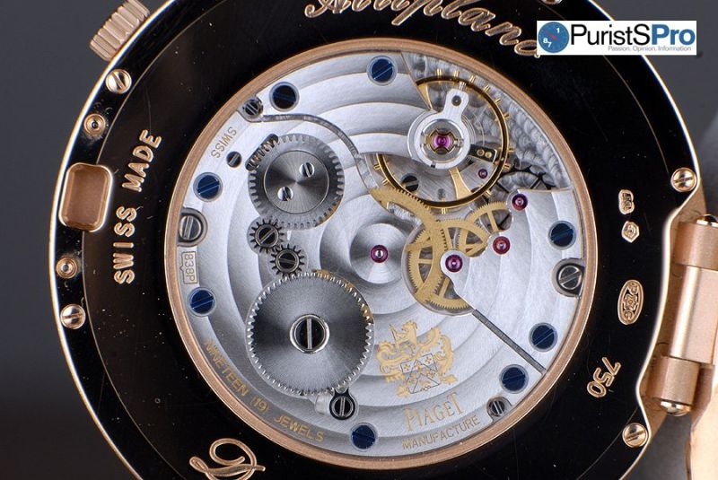 The upper watch houses Manufacture Piaget movement 838P, a wonderfully finished ultra-thin (at 2.5mm) caliber that exudes elegance -- it's well-designed, and the movement layout never feels forced. The Piaget DNA is all here in this third-generation of very thin hand-wound mechanical movements from their manufacture (calibers 9P and 430P/450P being the previous ultra-thin generations respectively). Signature decorative elements such as circular Geneva stripes, and blued screws convey that Piaget message of beauty with integrity of purpose; not audacious and overdone decoration.