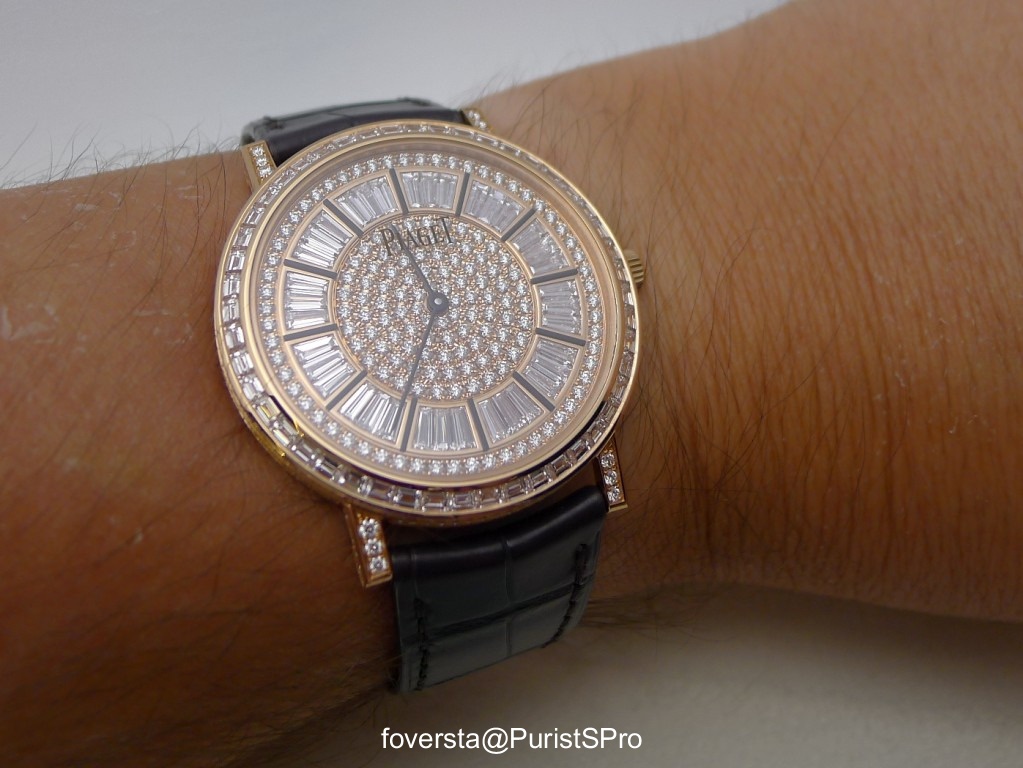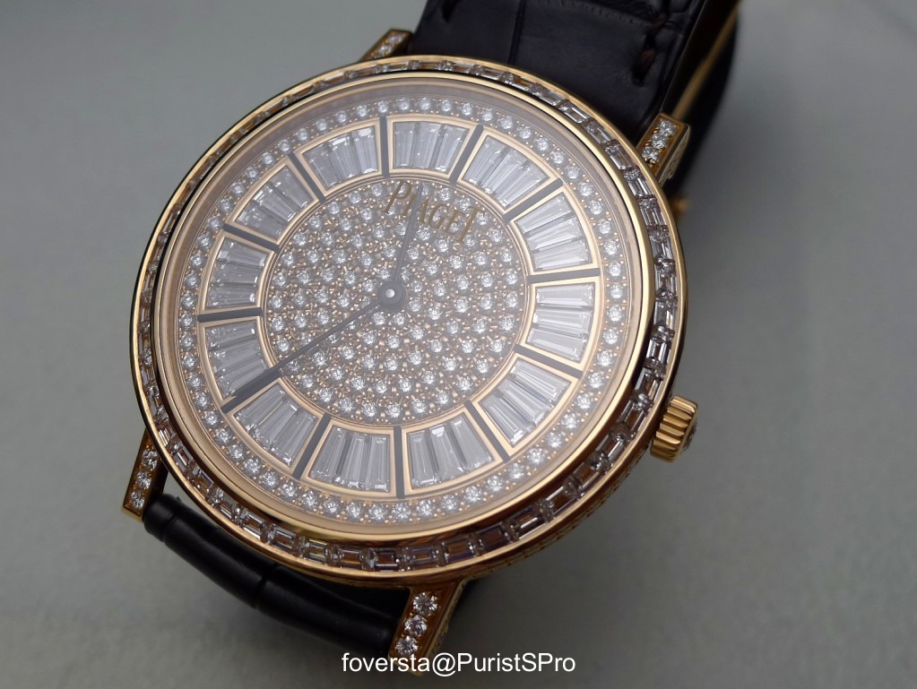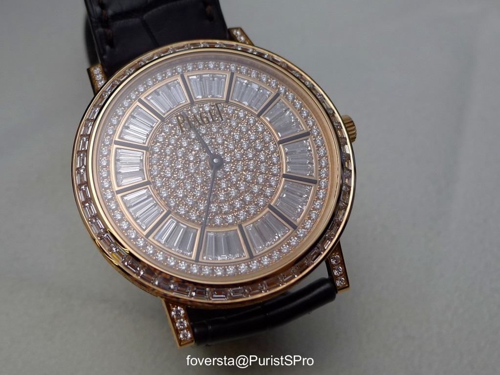 This 41mm Altiplano is powered by the 1200P micro-rotor movement. Look at the perfection of the dial setting. It combines 155 brilliant-cut diamonds and 36 baguette-cut diamondfs (3 per hour!). The PG case is set with 313 brillant-cut diamonds and 48 baguette-cut diamonds.