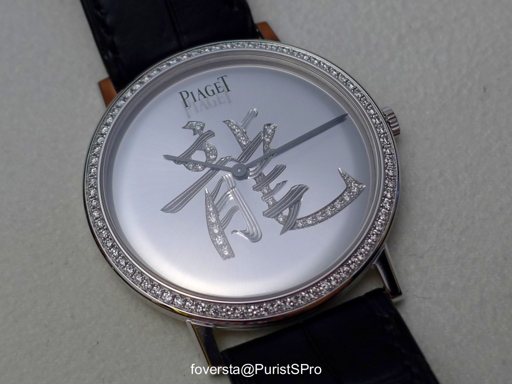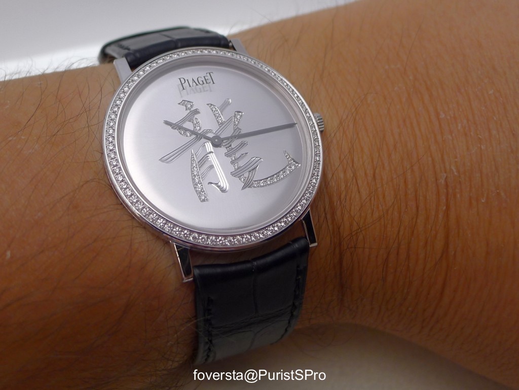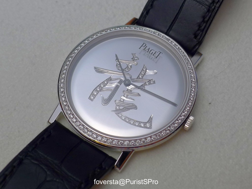 The ideogram is very well made mixing engraving and gems set parts. The thin and discreet Altiplano hands are perfect in this context since they don't hide the chinese characters.