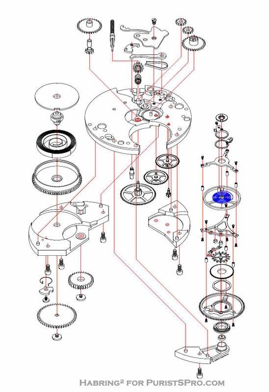 "I counted 21 (17 + 4 rubies) parts when counting the Incas as one part each (actually they contain four parts as you know) the bridge not counted. 27 with all parts counted we call "maintenance relevant" (those you disassemble at a regular service). On the picture we're missing the 6 pillars and their 12 screws - so all together 45. If we reduce it to those parts which are really turning then we have to reduce it by the lower Inca, the central tube which holds it, the fixed wheel, and the inner part of the ball bearing. (41) Lange would count in addition all the separated parts of the balance (every single screw), anchor, and so on (they define it as parts to be produced) balance=25 parts; pallet fork=6; escapement wheel=2; regulator=3; porte-piton=4. So in total I count 81 ;-)Let's keep it 40! ;-)" And all that weighs less than 0.6gramm despite the large 15mm cage with 13mm balance wheel and the use of no exotic lightweight materials such as titanium.
