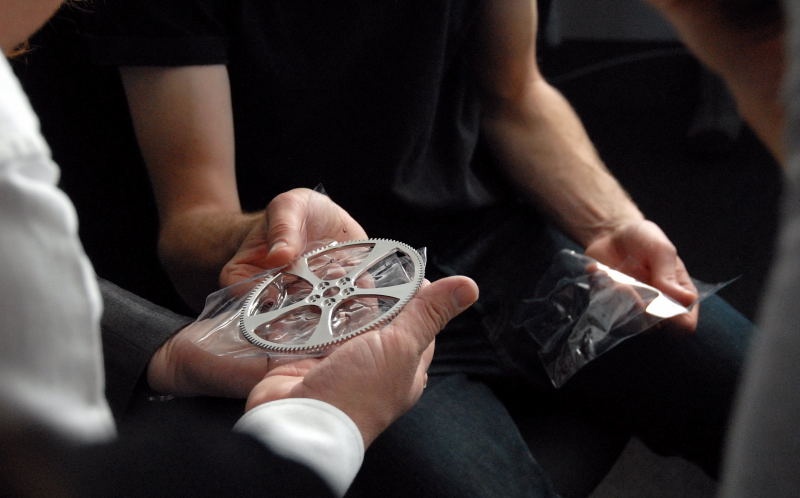 The main baseplate is moved around with a small crane, the cog wheels are bigger than your hand, but the finishing and aesthetics for the component parts of the mechanism are still very much Richard Mille!