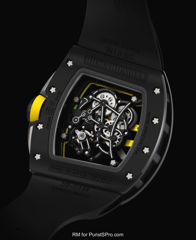 For every big brother RM watch, there is a younger brother to go with it! And this time, it is the Yohan Blake. Same movement as the RM035 and RM055, but with the stylized bridges, a Zirconium compound for the case upper and lower bezels and NTPT carbon for the inner case band. The crown has protectors and the watch is built to withstand a massive 5000G shock.