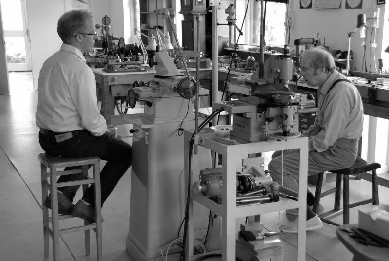 With the Co-axial Anniversary watch coming up, Roger splits his time between his own workshop (just a few miles down the road) and Georgeâs. They are finalizing plans for the Anniversary watch and in the coming months, production will start. This will entail making every component from scratch, by hand. The Anniversary watch will be a first for George, and a continuance of Rogerâs own philosophy in terms of the watch. The same properties that George brought to his watches, and Roger has brought to the Series 2 production watch, will be wrought into the Anniversary watch. The watch is something that is robust, but exquisite in finish; individual in terms of production, but also in terms of being worn and used. It is anything but machine made in design, content, and finish; it contains the complete value of the individual watchmakersâ skill