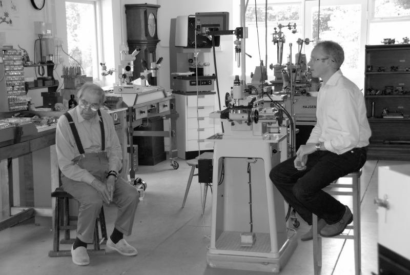 [George Daniels and Roger Smith at work in Daniel's workshop]