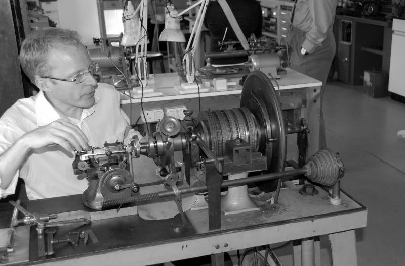Hand turning dials is a ridiculously time consuming way of manufacturing them, but the depth and breadth of the patterning, the quality from the watch maker in turning that dial, has no equal. Roger sat down at one of the machines to show me how the hand turning is accomplished. He had the look of a past victim coming face to face with his torturer once again. A pattern is accomplished by fixing the metal object to be patterned on the disk. Each one of the patterned dials to the left (of the seated Roger) when used in combination with the oscillating mechanism and the hand turning of the metal disk will produce a pattern. For something that looks simple, such as the squared pattern on the main part of the dial for the Series 2, requires that you do one set of lines (across the squares) going one way, switch the disk around, and then work the pattern at a 90 degree angle from where it was. There are so many possibilities for it to go wrong. One small mistake and you can start the whole dial pattern again. The other obvious fact here is that you can only pattern one dial at a time. The machine might help with the pattern regularity, but the dial is hand-made. It requires concentration, precision, and hand crafted skill to produce the dial. A wry smile from Roger: âGeorge used to get so cross with me as I was learning to hand turn the dials. I made so many mistakes to begin with.â Roger has now the Masterâs hand, as the dials of the Series 2 attest.