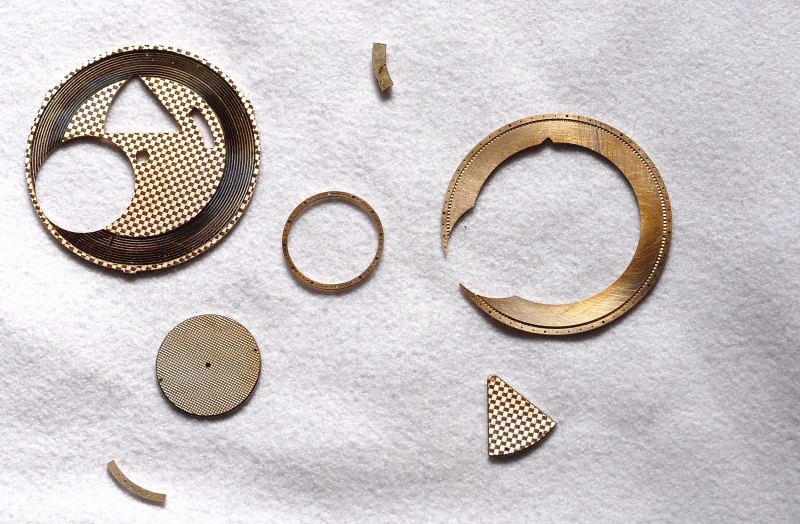 [The hand turned dial parts for a Series 2. Each part has been shaped and made by hand, and the pattern on the dial applied by hand]