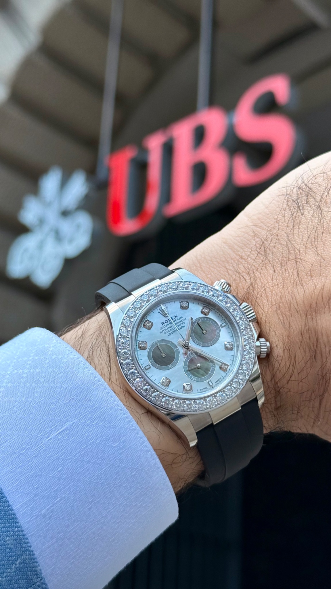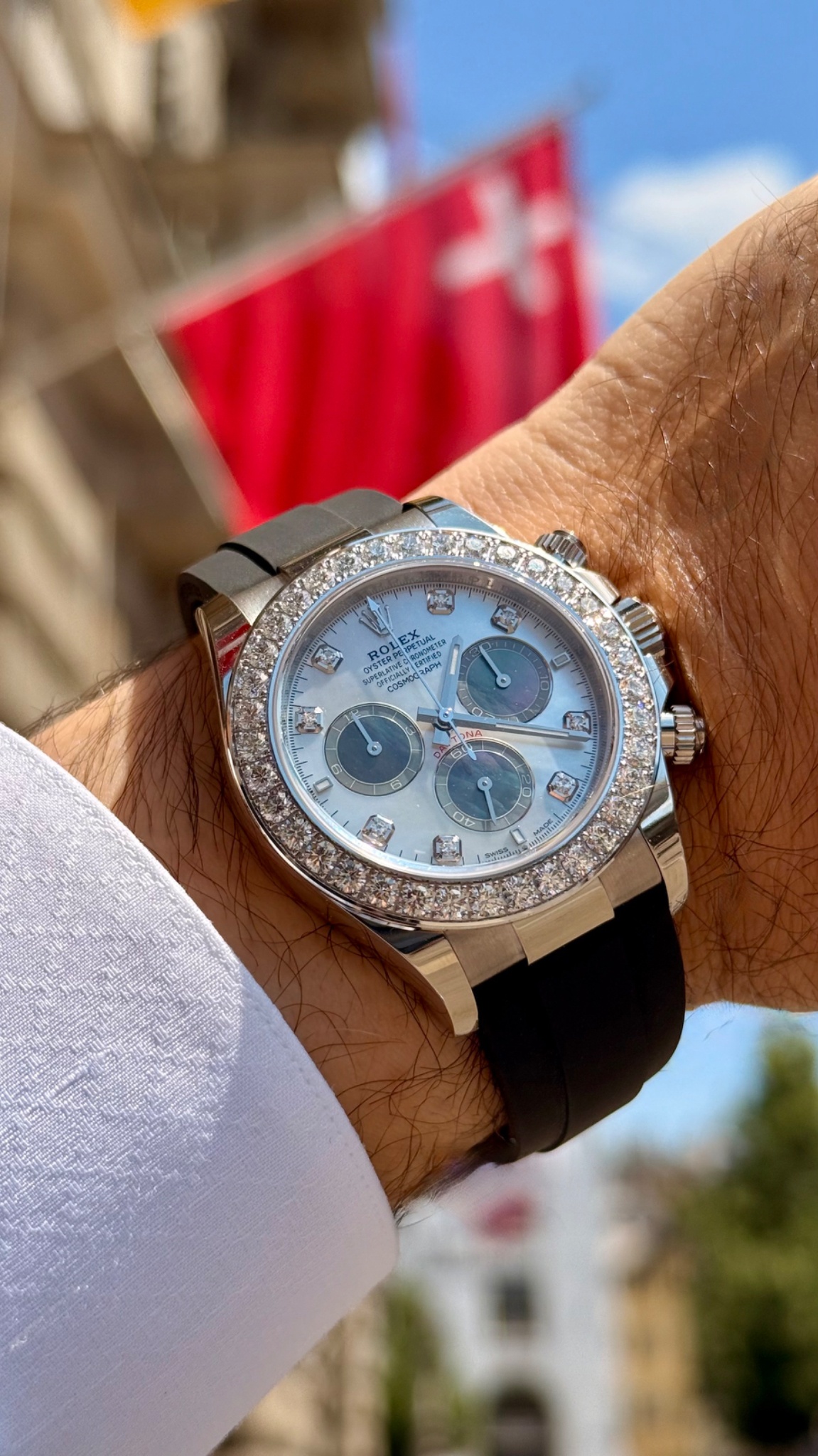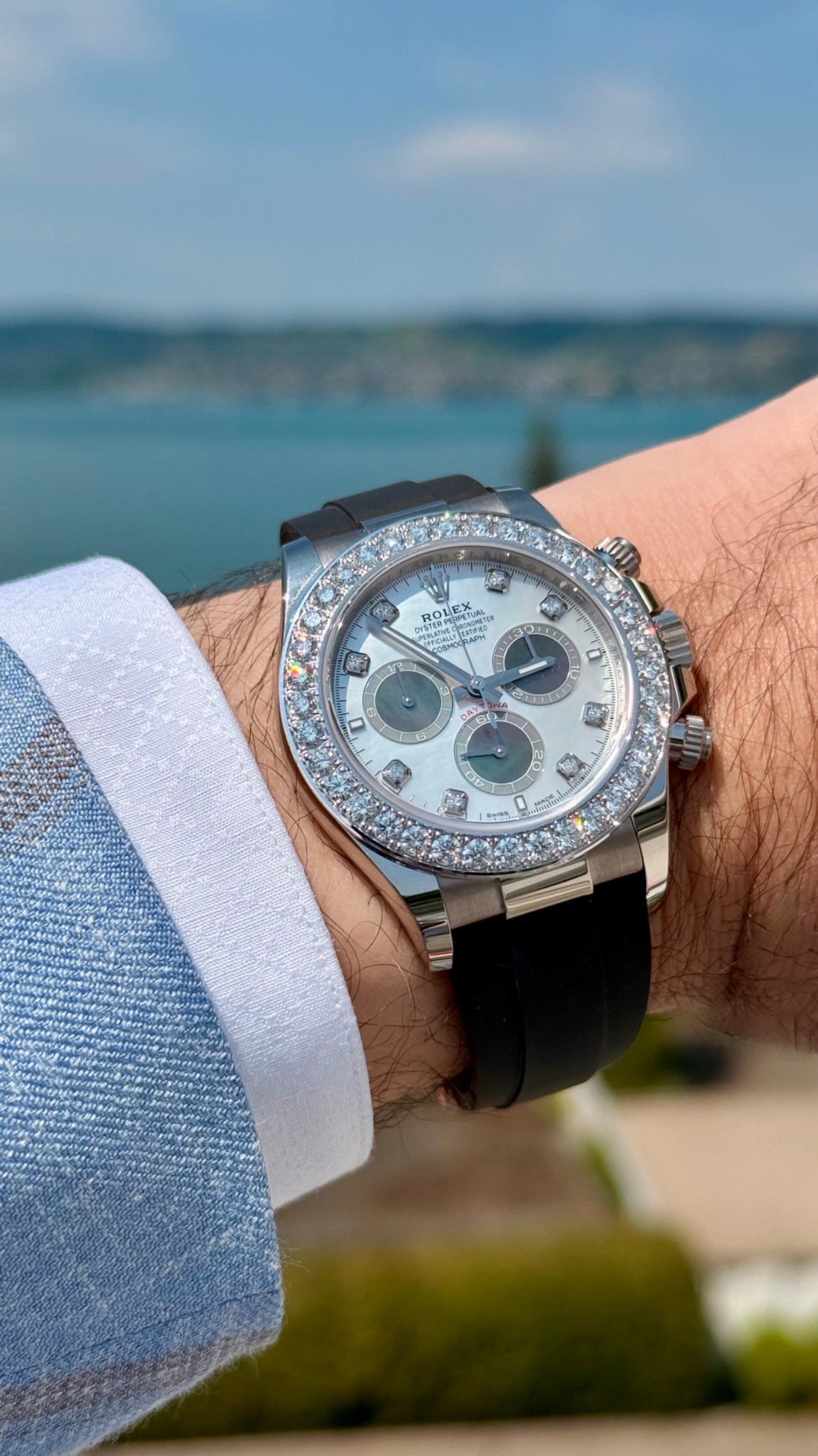 To me, this is nothing short of a masterpiece. Versatile? Understated? Well... 💎😁 Let's just say it's "subtly spectacular"! No pavé dial or diamond-set lugs here—Rolex showed remarkable restraint, letting the mother-of-pearl dial and bezel diamonds do all the talking. The combination of white gold, those perfectly set diamonds, and the Oysterflex strap creates something truly magical. It's sporty yet supremely elegant.