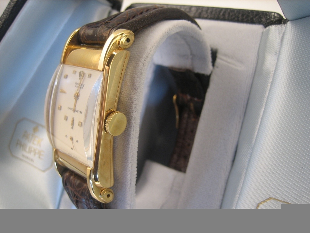 One , as mentioned earlier is that it has a special movement, initially made by Aegler and Wilsdorf , when in 1927 a patent was filed for a “shaped watch movement with a seconds dial. In this new watch the winding barrel and the balance wheel were at opposite ends of the movement allowing for a larger balance wheel and thus more accuracy. A larger winding barrel also meant that the watch could run for longer on a single wind. This allowed most Princes to be chronometer rated and most were indeed sold with a chronometer certificate( see ref 971A…)