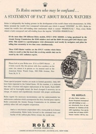 So we have a semi-official recall of Submariners (not just GMTs) ca. 1960 and the swapping of dials to a demonstrably less radioactive version (the Geiger doesn't lie and the jewelers admitted the motivation, after all).