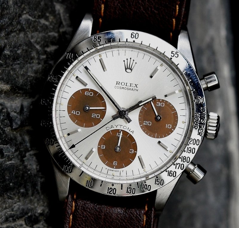 The Cosmographs are also subject to the dial color change phenomenon: here’s a pump pushers ref. 6239 where the black subdials have faded to light brown (Photo P. Stahl):