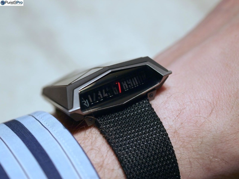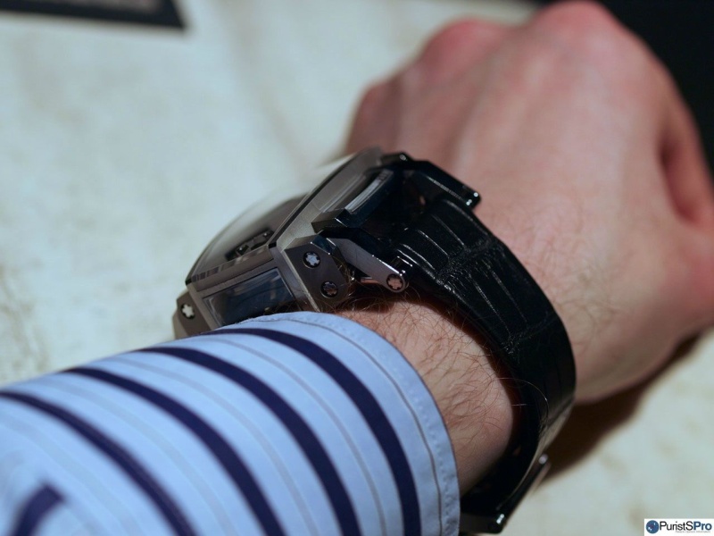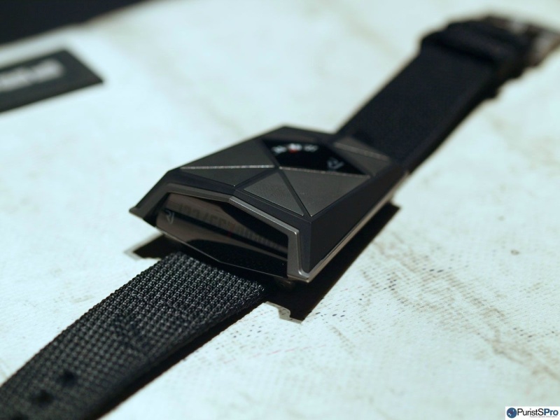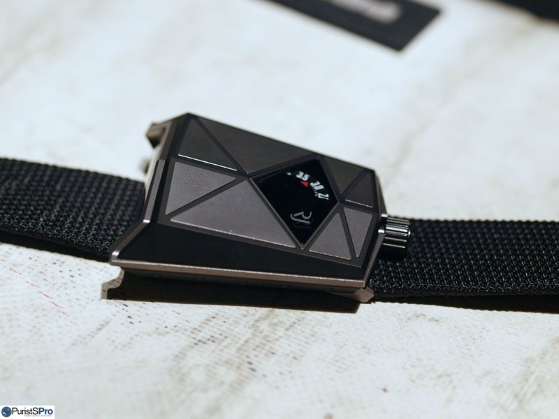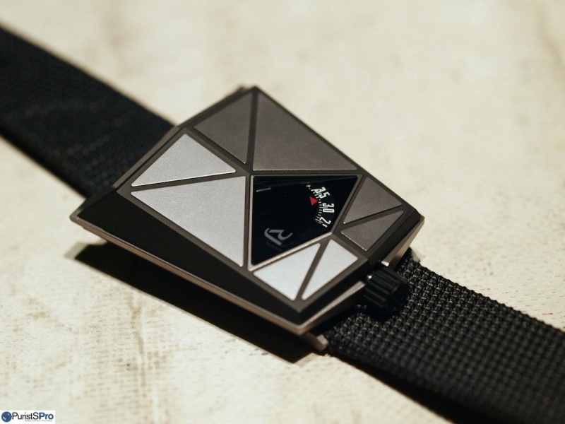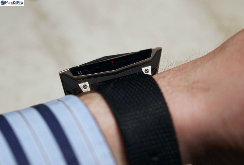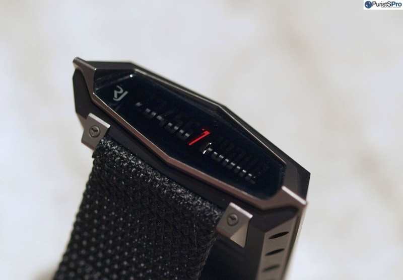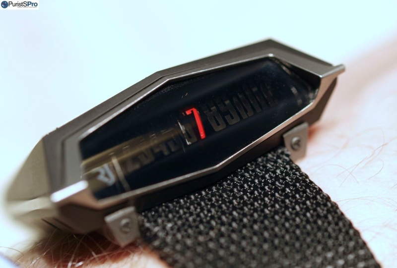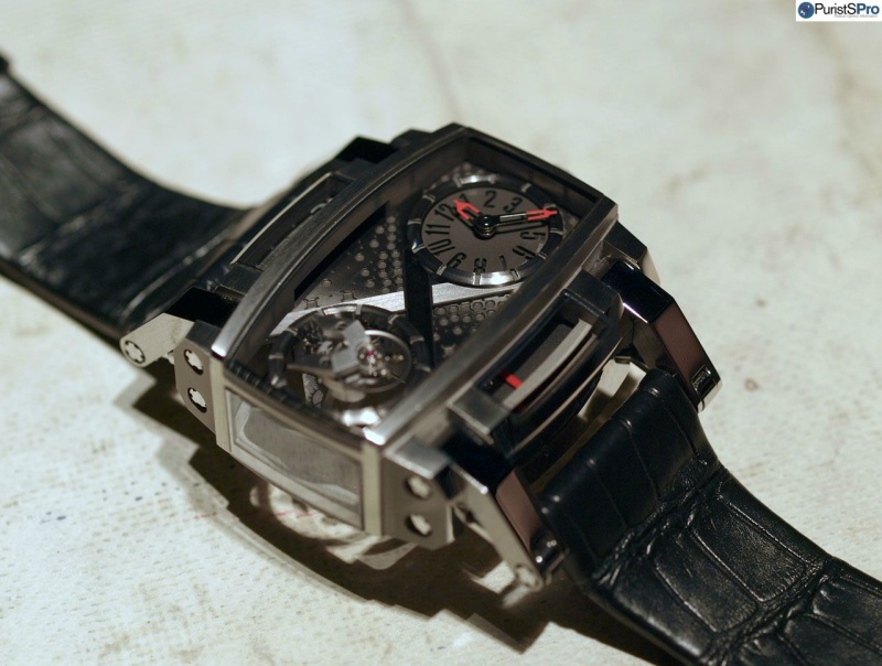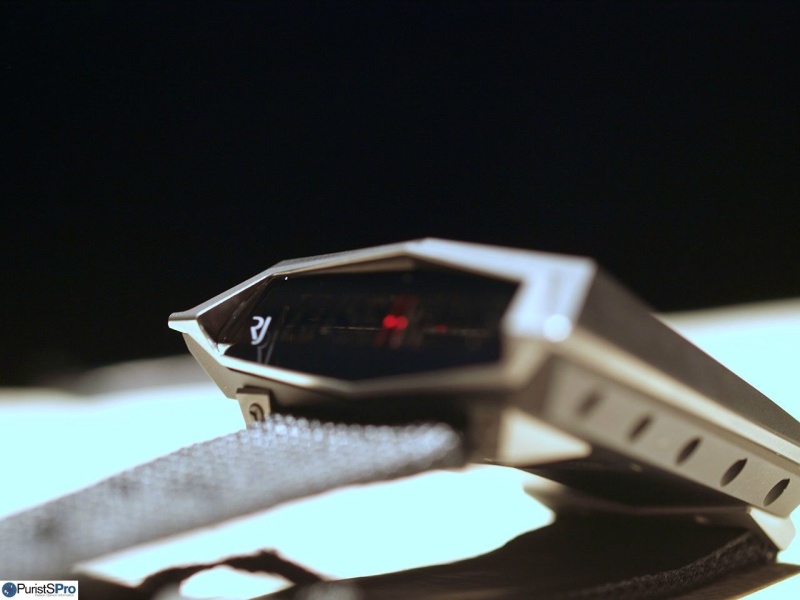 "A black rotating disc with a red indicator transferred on the sapphire crystal indicates the minutes on the top of the case, while the linear hour display is read off laterally, thereby giving time a whole new dimension." [Press Kit]