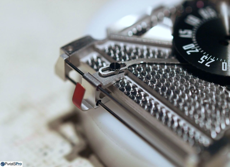 The movement features a kind of spring-driven carriage that drives the hour display visible on the side of the watch by means of a red-lacquered cursor moving beneath the metallised sapphire crystal every 60 minutes.