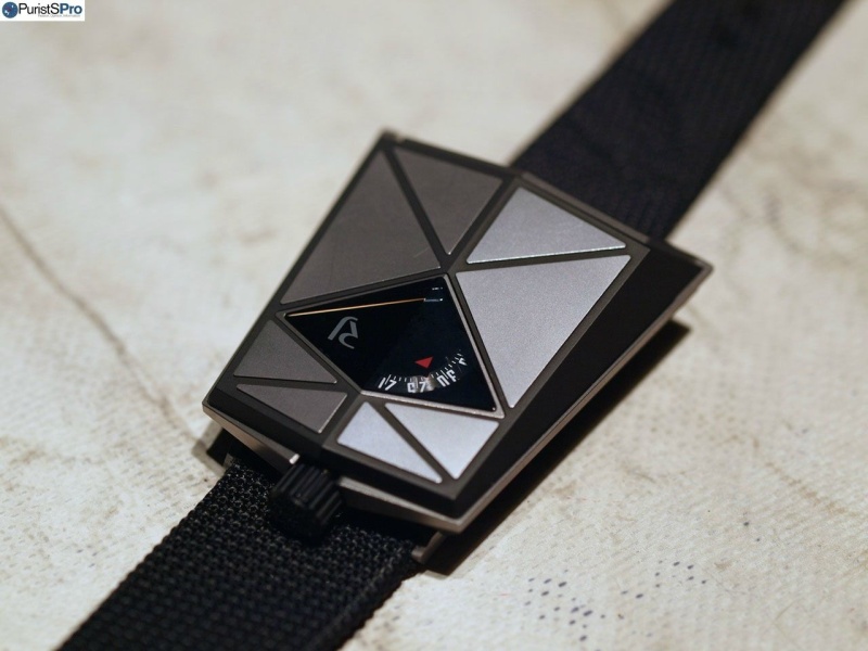 "An unusual trapeze-shaped model featuring a black PVD-coated titanium case, the Spacecraft both surprises and intrigues. Its rectilinear profile and its facetted surface echo the aesthetic of spacecraft." [Press Kit]