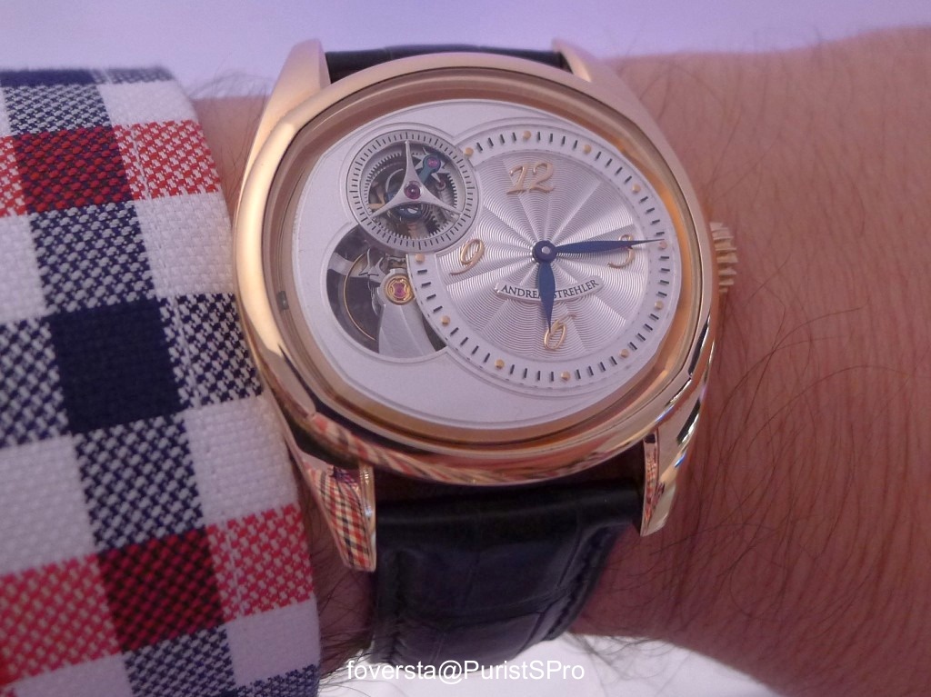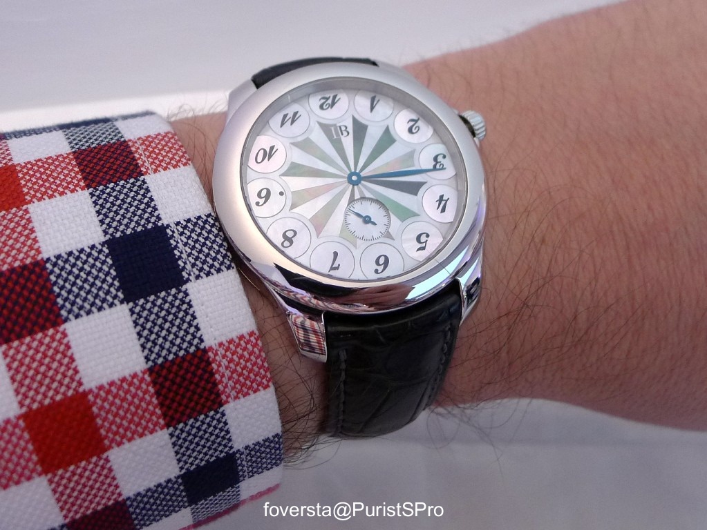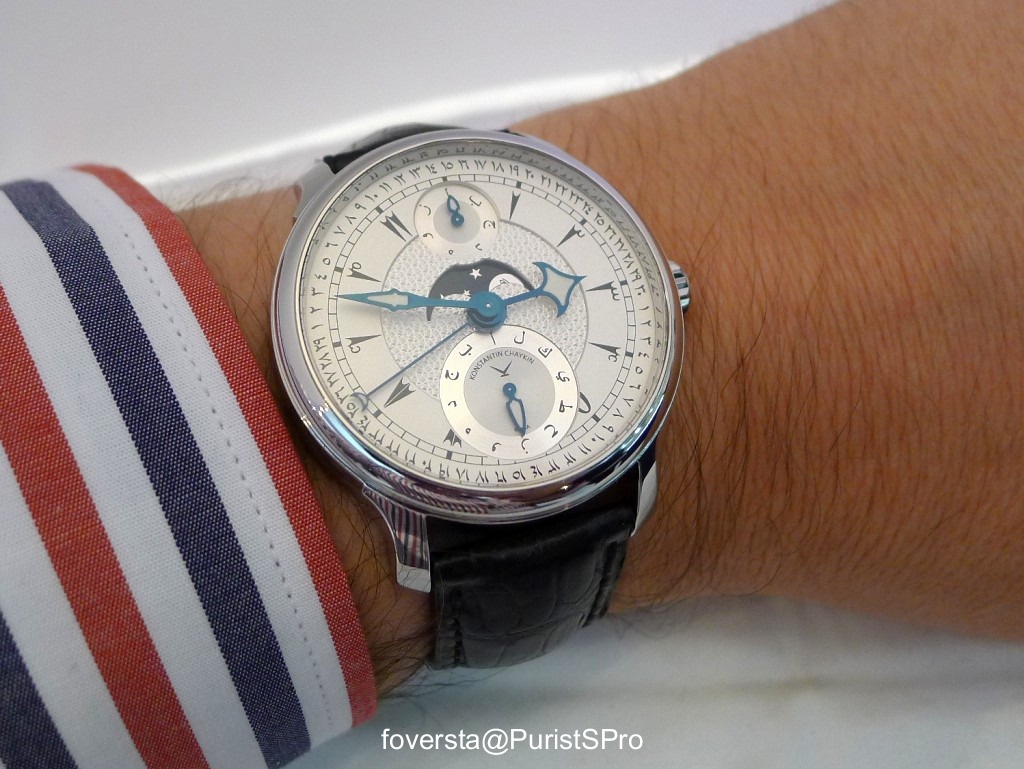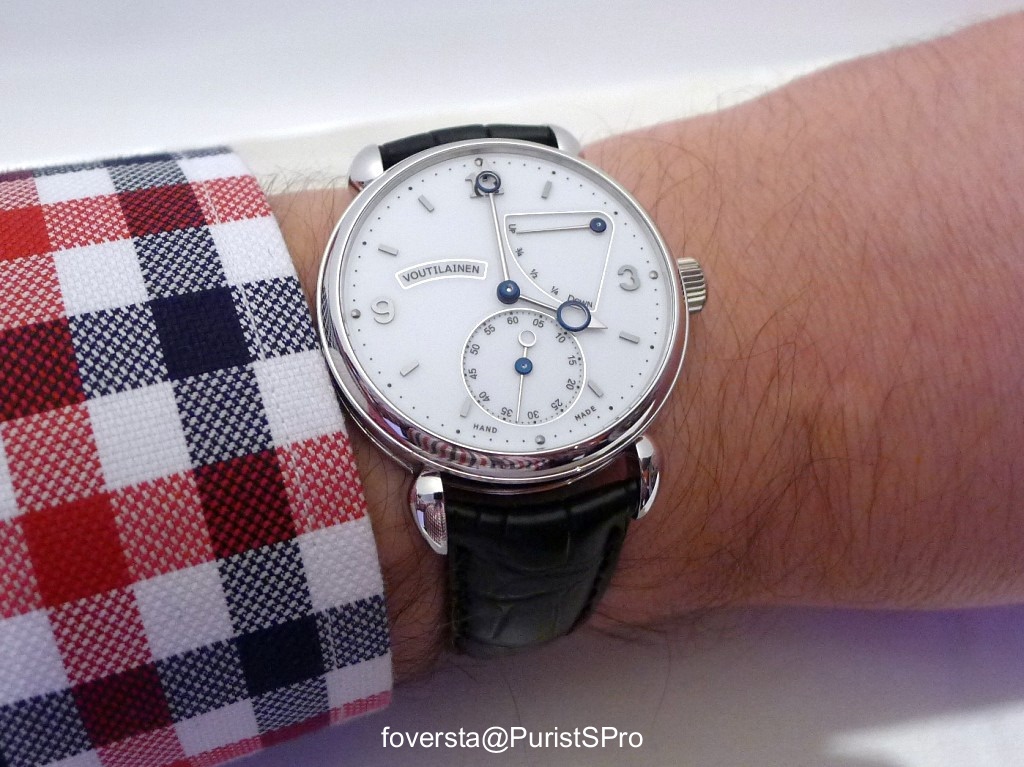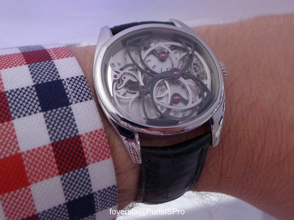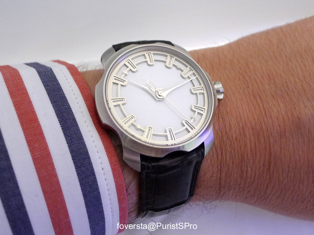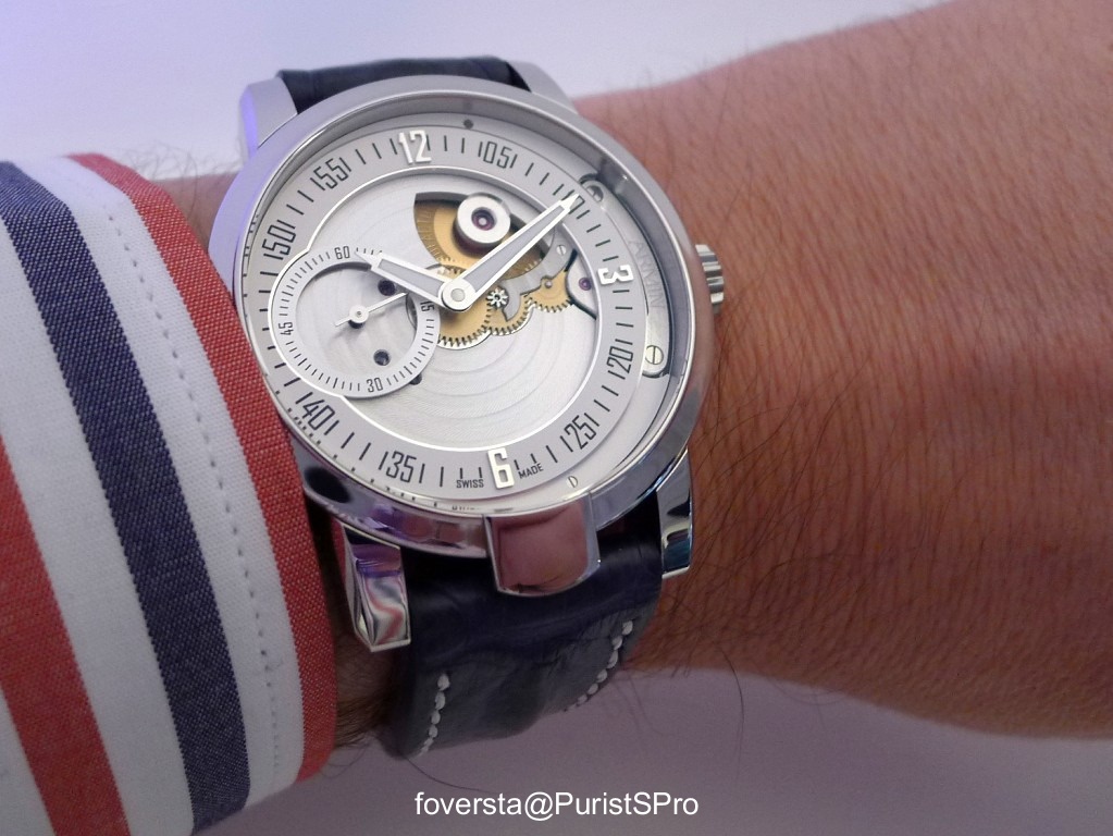 Stepan Sarpaneva was presenting a prototype of the watch with a white enamel dial. I am not convinced by this watch, I think it is too simple and bright for Stepan's style. A black enamel version will be presented and I believe that it will be much better!