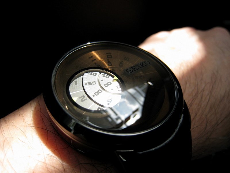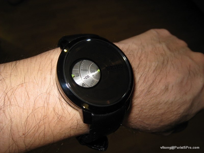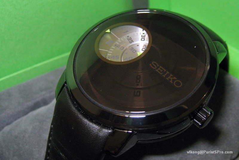Searched high and low for information about this Discus-Burger and discovered it belongs to the "Seiko Moving Design Collection" launched in August 2007. However the official name is Seiko Discus and this series has 2 models. One full black ( Ref : SCBS007) and the other one is with white dial (Ref : SCBS005), designed by Tomoko Tomita from Design Center of Seiko Watch.