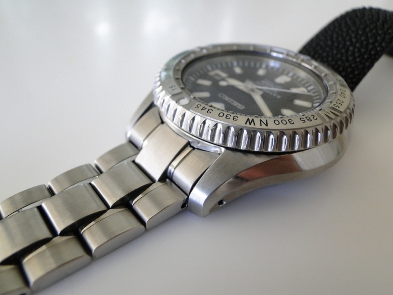 Like many other of my Seikos, this watch came on a bracelet. I prefer to wear it on a sting ray strap that complements the intricate bezel, but I located the bracelet for this post. Here's what the watch was intended to look like.