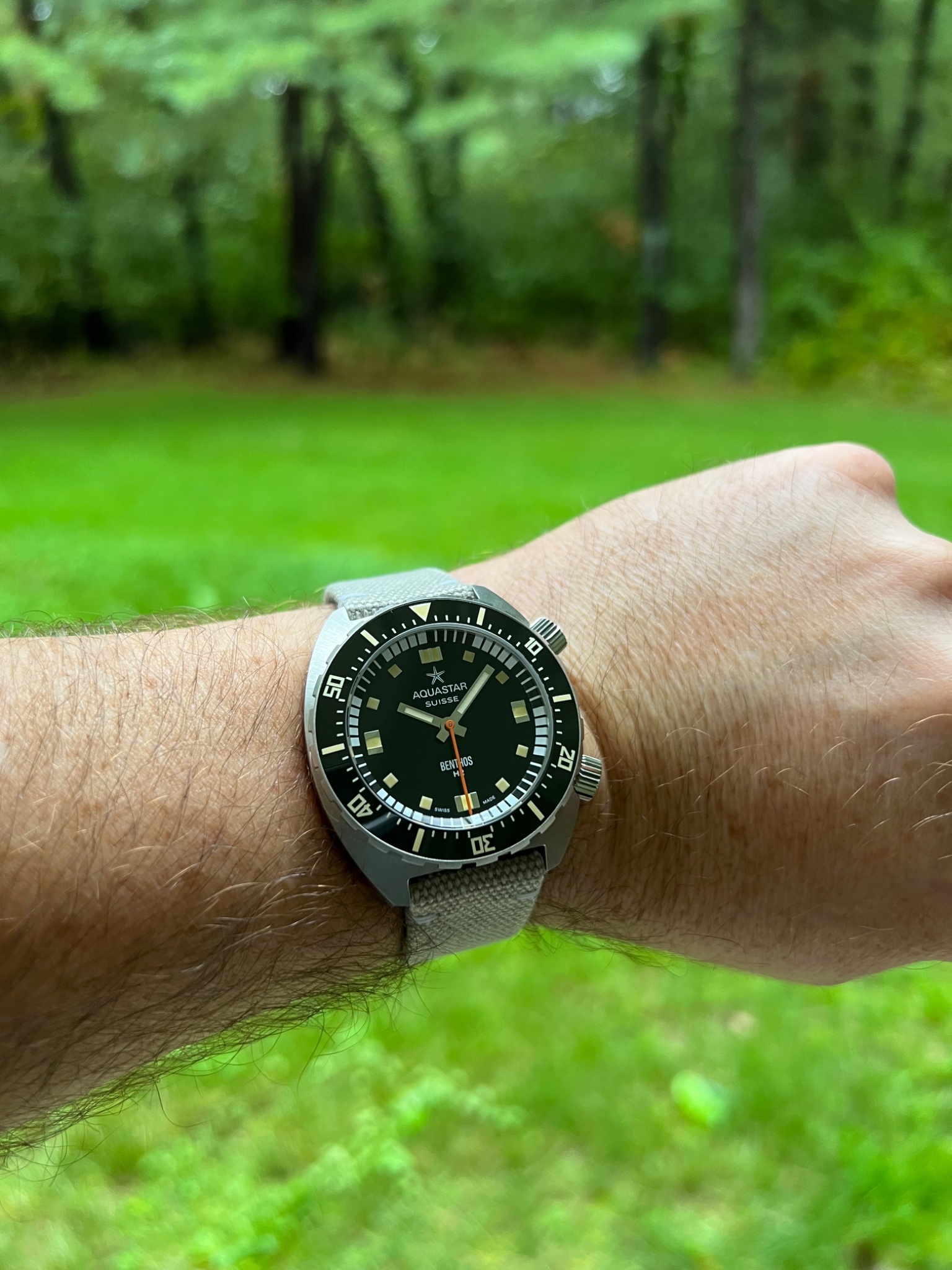the Seiko emerald green is a pleasing color and I like seeing the waves in the bright light. The Aquastar has the more badass approach to being a dive watch. Just my 2 cents.