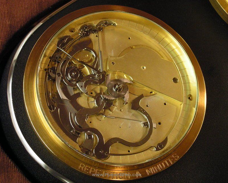 Quarter repeater with a disk musical mechanism with 23 notes driven from both sides of the pinned disk.
