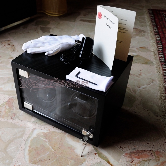 The watch winder with all of its accessories: the crystal door keys, the user's manual, the adapter, a pair of cotton watch handling gloves, a microfibre watch cleaning cloth, an hex allen key (to open the motors' covering).