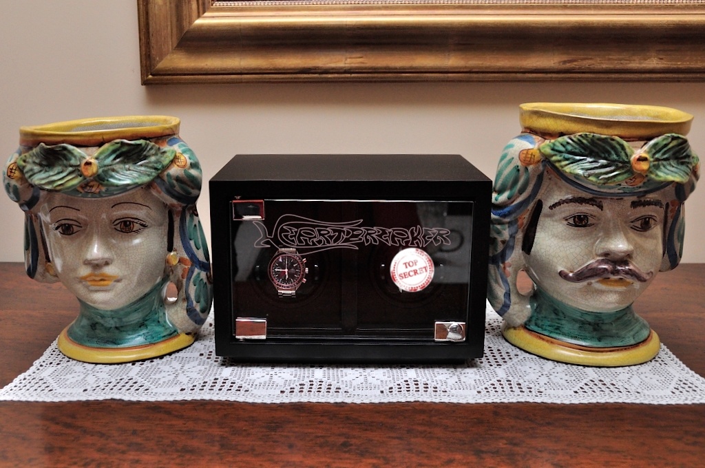 Other two home shots: this time the watch winder is on a living room's small table (near a ceramic lamp from Caltagirone) and on the dinner room's server (near to two ceramic "testa di moro" from Caltagirone).