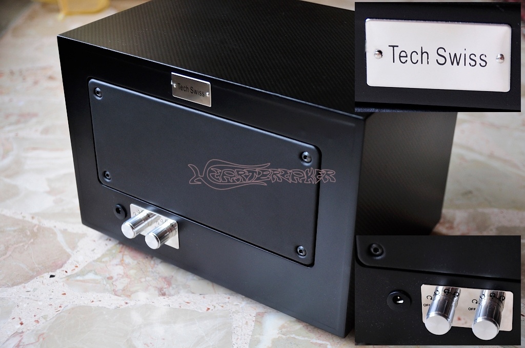 Let's take a look at the back side of the piece, where we find: the name of the Constructor (Tech Swiss, from California); the chromed 5-positions switches (to turn on the two watch winders and select one of the 4 pre-programmed modes); the motors' covering and the power jack. In my experience, when it comes to electronic devices, you can appreciate the quality of a product looking at their back: in this case I've noticed a very pleasant finish with perfect joints and very robust control swithes with an excellent tactile feeling.