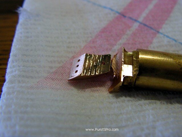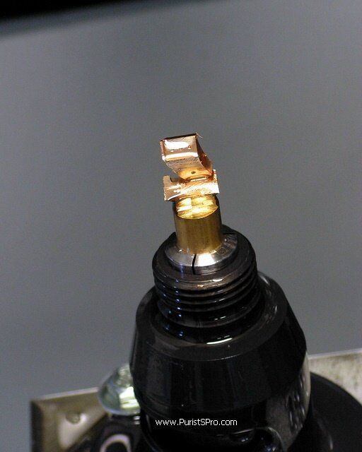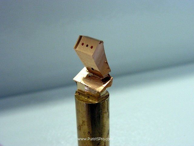 The last step in making this horn is cutting it off from the support. This is done with a small saw blade. It leaves the horn attached by just a tiny bridge of metal so it can be easily broken off.