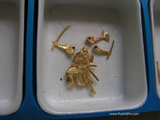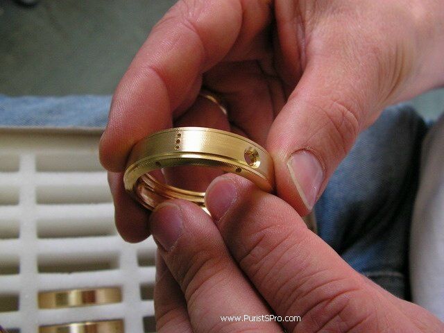 This box holds the 18k rose gold blanks for 5 cases. The blanks are stamped to approximate size to reduce the amount of gold that needs to be purchased and also the time needed to machine the piece. As can be seen here from the blanks each case consists of 4 horns, the case band and the front and back bezels.
