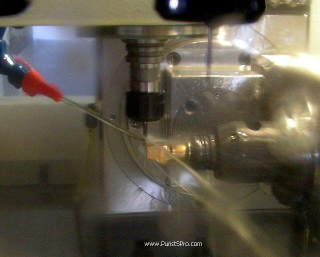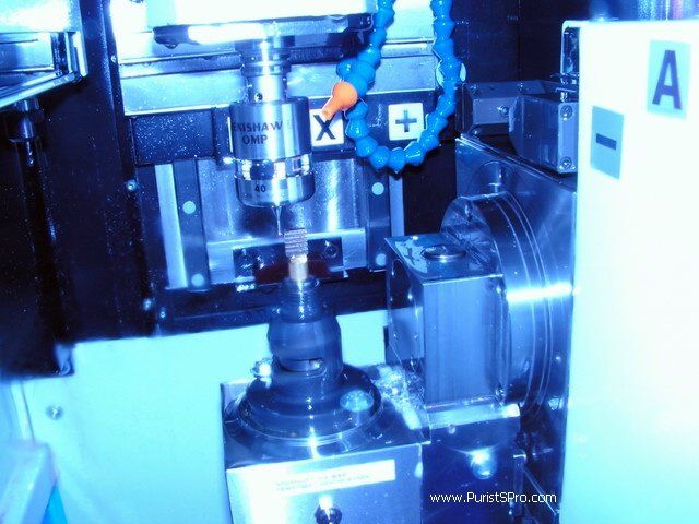 After measuring all the tools the CNC then measures the work piece to know its exact position. The measuring tool shown here communicates with the control computer by infrared transmission so it can be treated like any other tool by the machine mechanics. The light in the machine is not on during this process, to support the transmission of the data to the sensor. My camera seems to have been disturbed by the infrared which gave the next photo has its special color.