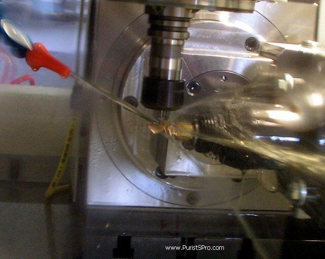 Because of their small diameter the tools need to work at very high speed to have optimal cutting. This also makes cooling necessary. The cooling is done by a stream of special oil which also acts to remove the metal chips. This machine allows cutting to up to 40’000rpm.