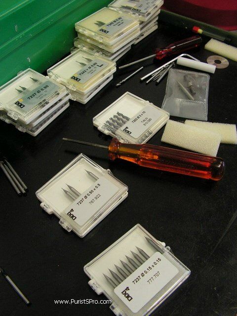 The cutting tools are hard metal carbide tools. Cylindrical and spherical tools go from 3mm down to under 0.1 mm. Here in the foreground we see cylindrical cutters, 0.15mm in diameter. For rose gold the entire set of tools needs to be replaced after each complete case.