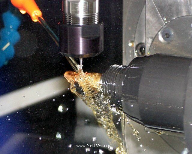 On the left we see a horn as it is finished on the CNC. It now needs satinage treatment and final polishing. On the right is a horn that came unglued from its support during machining. We can imagine how the machine is programmed to move forward and sculpt the horn out of the block of gold. Unfortunately this piece is now waste and will have to go back to the gold recycling. The investment in gold and machine time lost.