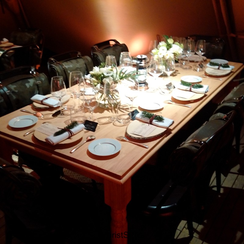 The guests were greeted to the sight of a giant 'Tippi-Tent' surrounded by burning fires and were warmed with glasses of mulled wine while standing and chatting around a huge fire pit.... this really was like Africa! Luckily everyone had dressed accordingly as we were given the instructions prior to event to dress for the outdoors (and no other information). I am fan of unusual events and Tudor had gone out of its way to organise this event which had all been put together especially for the evening.