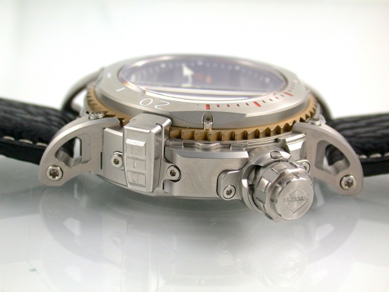There are no two ways about it - this is a statement making watch, with oversized case with a massive crown, visible gear teeth for the rotating bezel, contrasting colors, and sculpted lugs. The case in the model photographed herein is stainless steel, but there are also titanium and bronze variations, and each of the three is limited to 399 individually numbered pieces.
